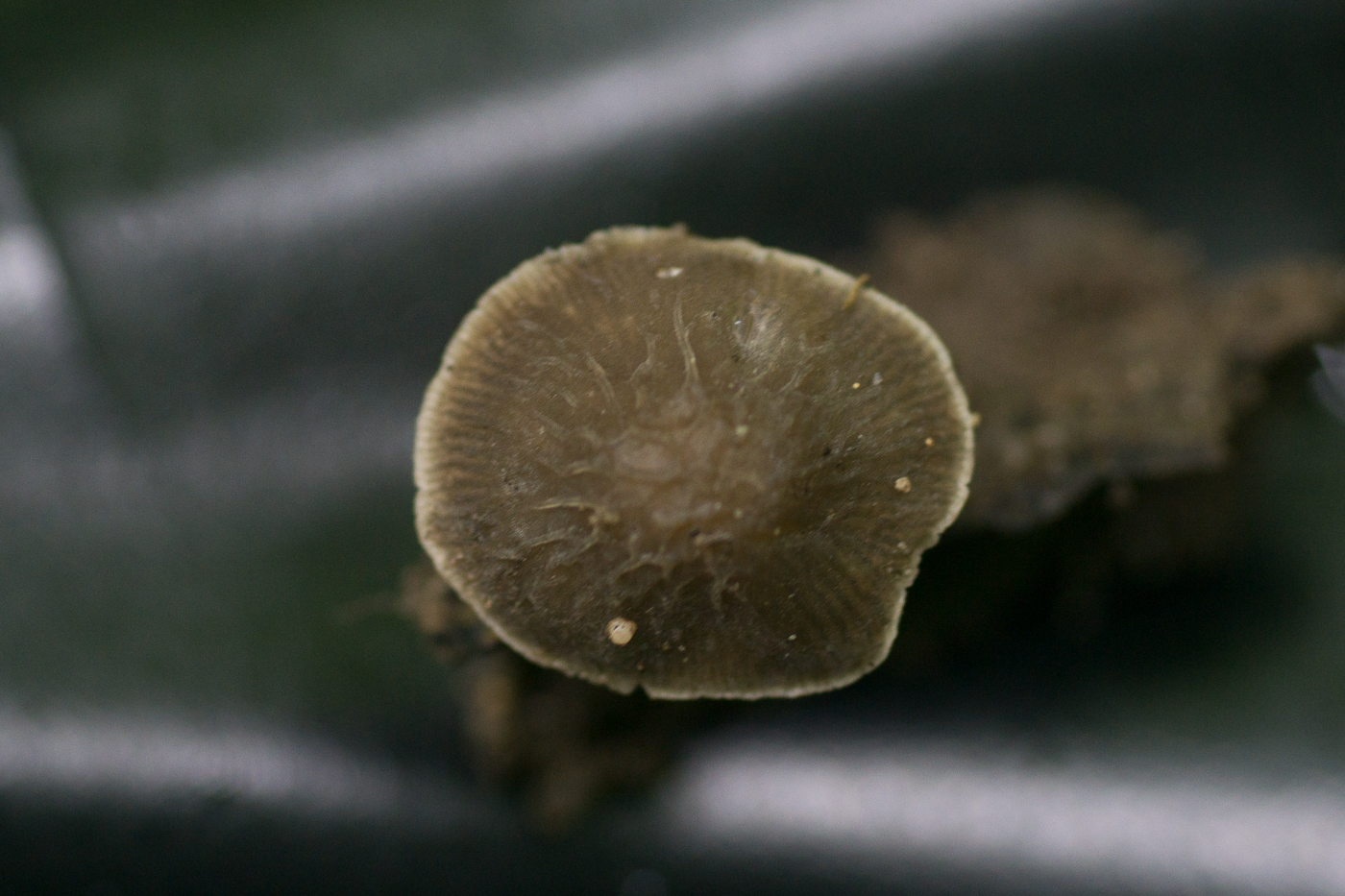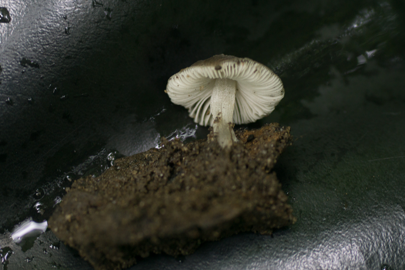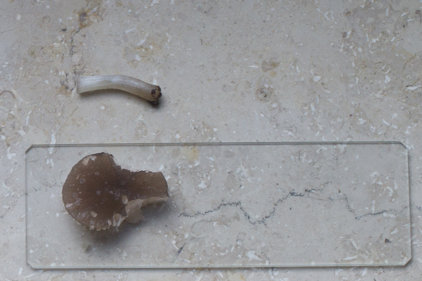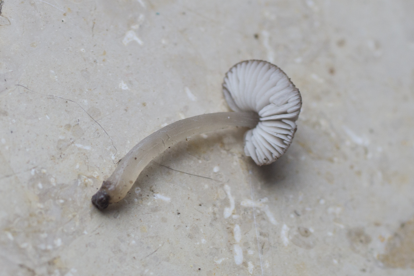 5. Bonus. Hier dachte ich erst auch kurz an einen kleinen Dachpilz, aber ich könnte mir auch Hydropus oder so vorstellen. Oder es ist was ganz anderes... Leider nur ein angefressenes, winziges Exemplar. Er hat nur dünn abgesport, aber das ist für mein Daherhalten eher ein weißer Abwurf. Habe hier aber wenig Hoffnung auf Klärung. Die Lamellen haben über Nacht einen gelblichen Schimmer bekommen.