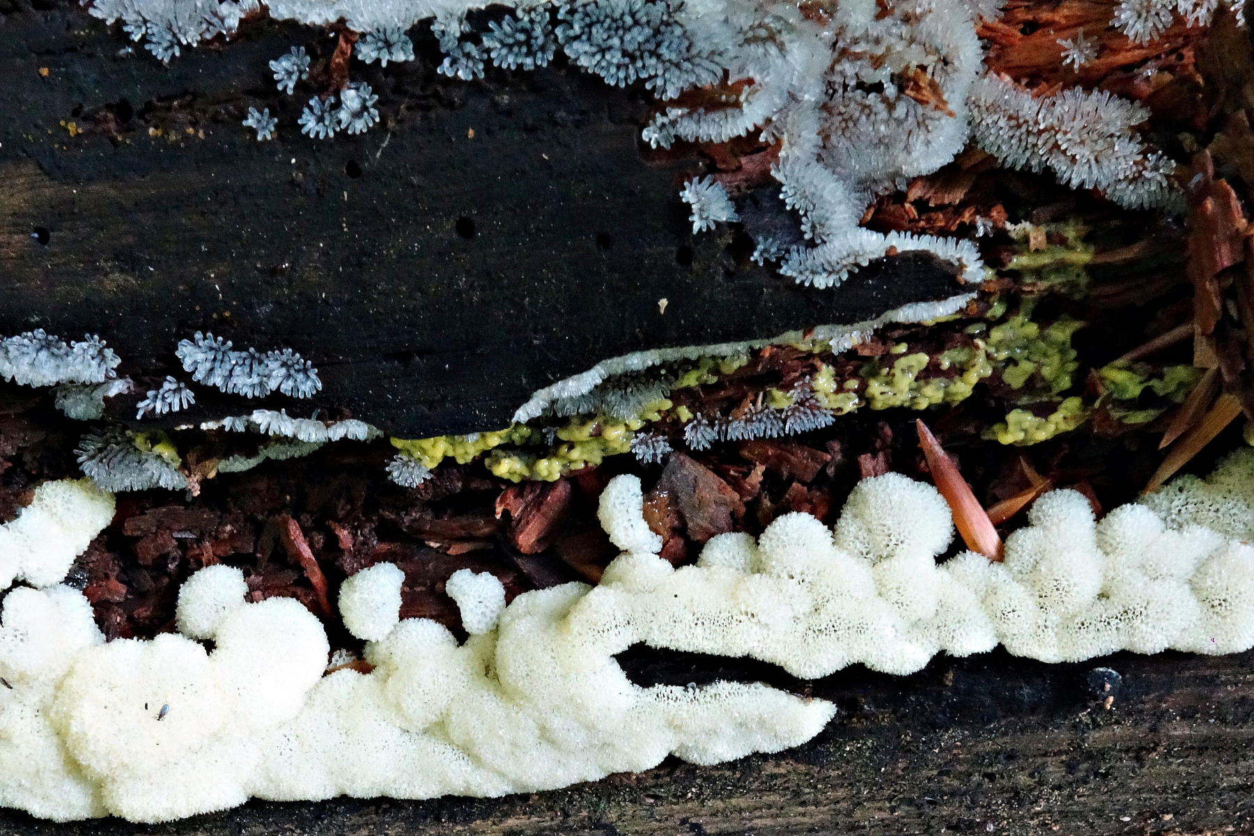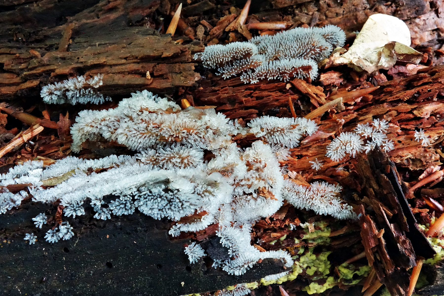 2b im Park Manhagen: Ich meine das sind Ceratiomyxa fruticulosa und var. poroides zusammen an einem Stamm.