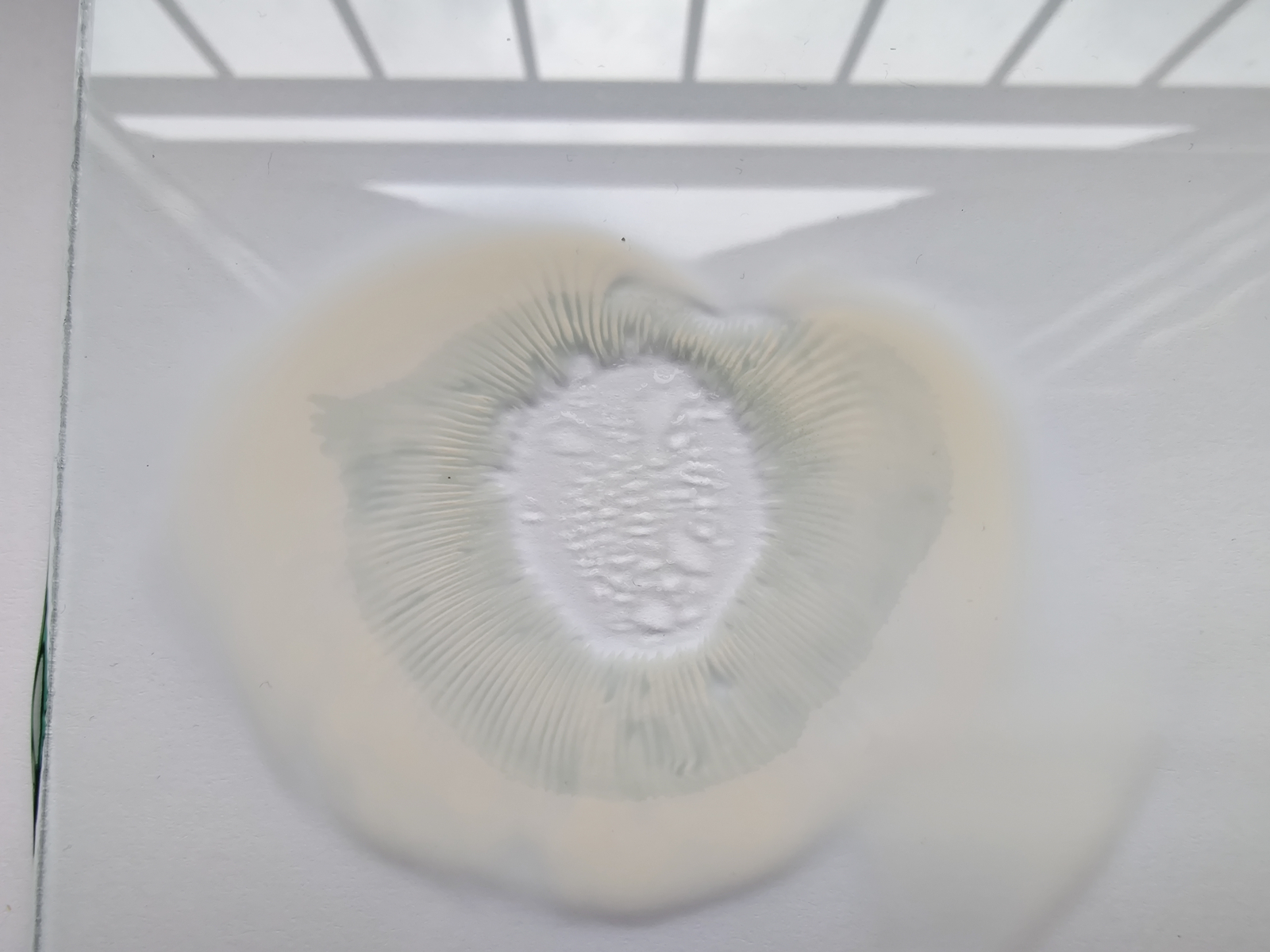 Lamellen: sehr weich, schmierig, teilweise gegabelt, leicht am Stil herablaufend, leicht creme-farben