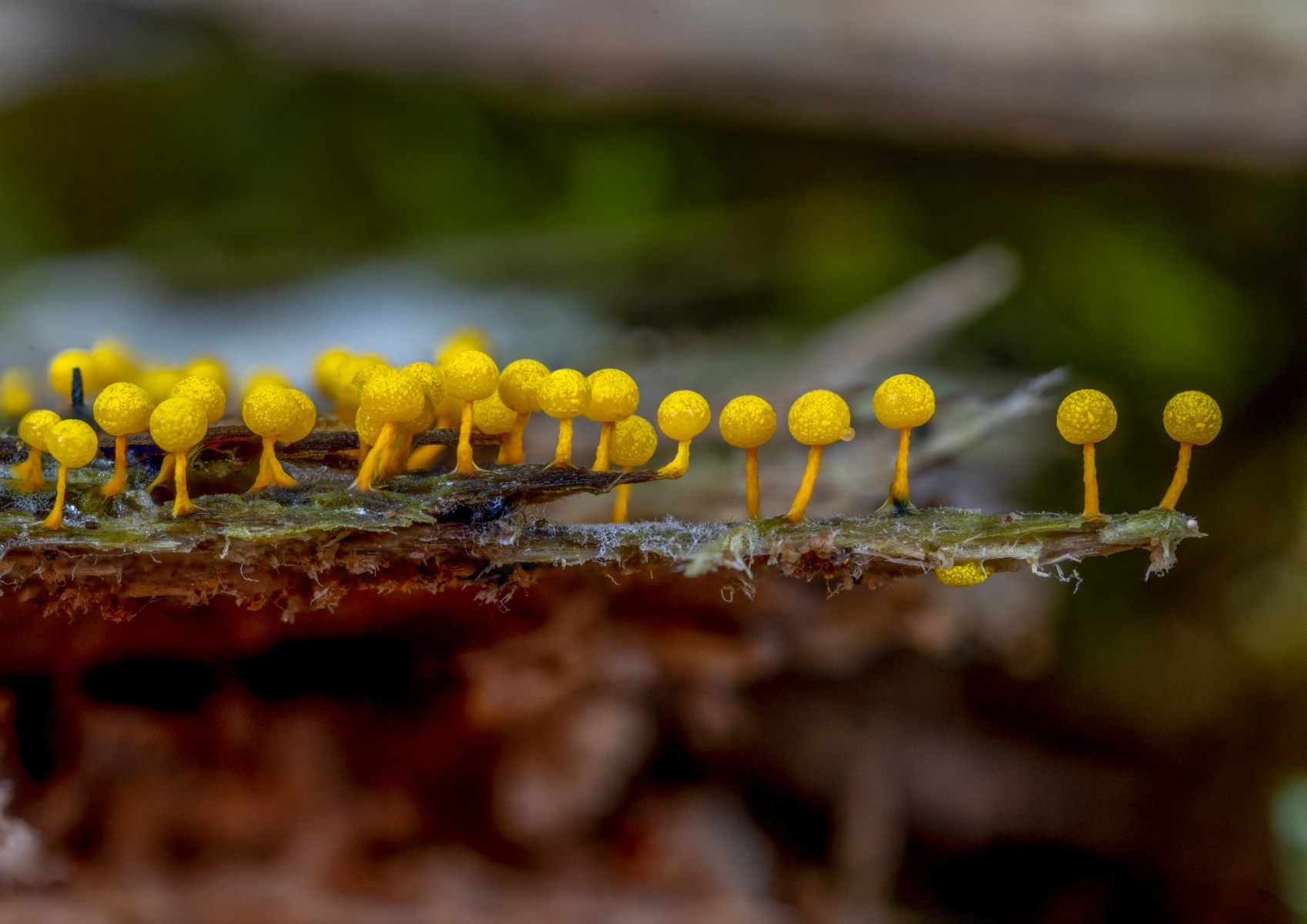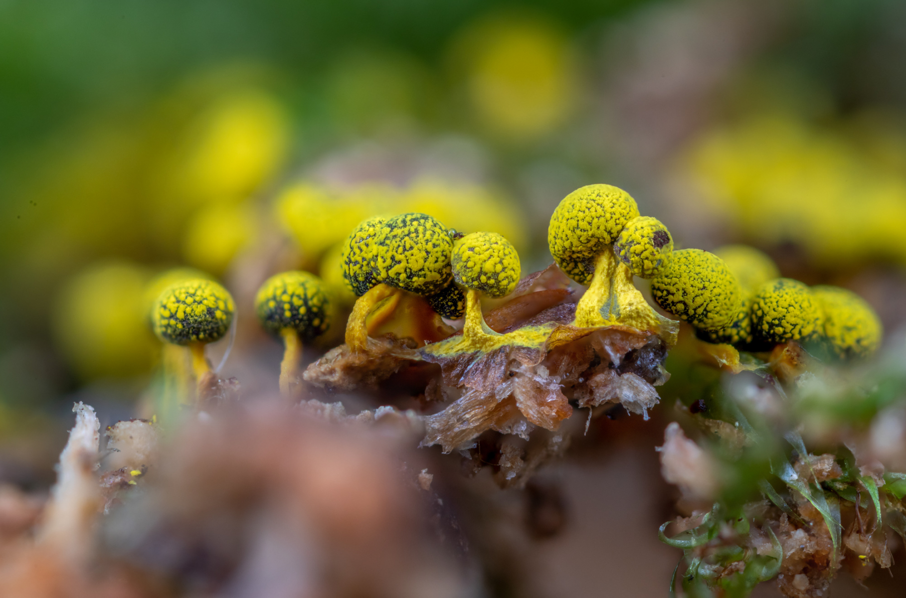 wie schon im letzten Jahr fand ich auch heuer wieder Physarum citrinum (immer an Nadelholzbaumstümpfen; teils direkt am Holz, teils auf dem Moos).