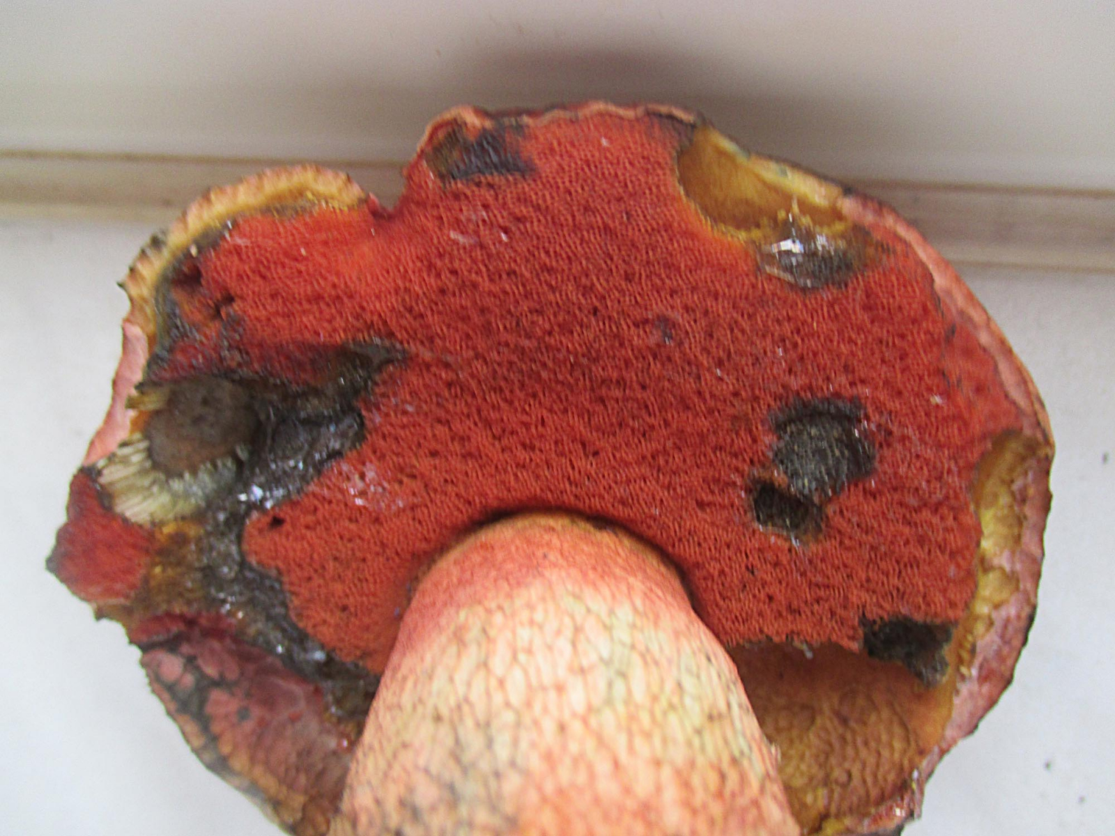 mein Sporenabwurf ist leider misslungen. Das Hutstück hat sich durch seine Nässe und dem Madenbefall in Matsch aufgelöst. Der Rest mit vorhandener Röhrenschicht habe ich getrocknet und wartet nun auf seine Bestimmung. Hoffentlich lässt sich damit etwas erreichen.