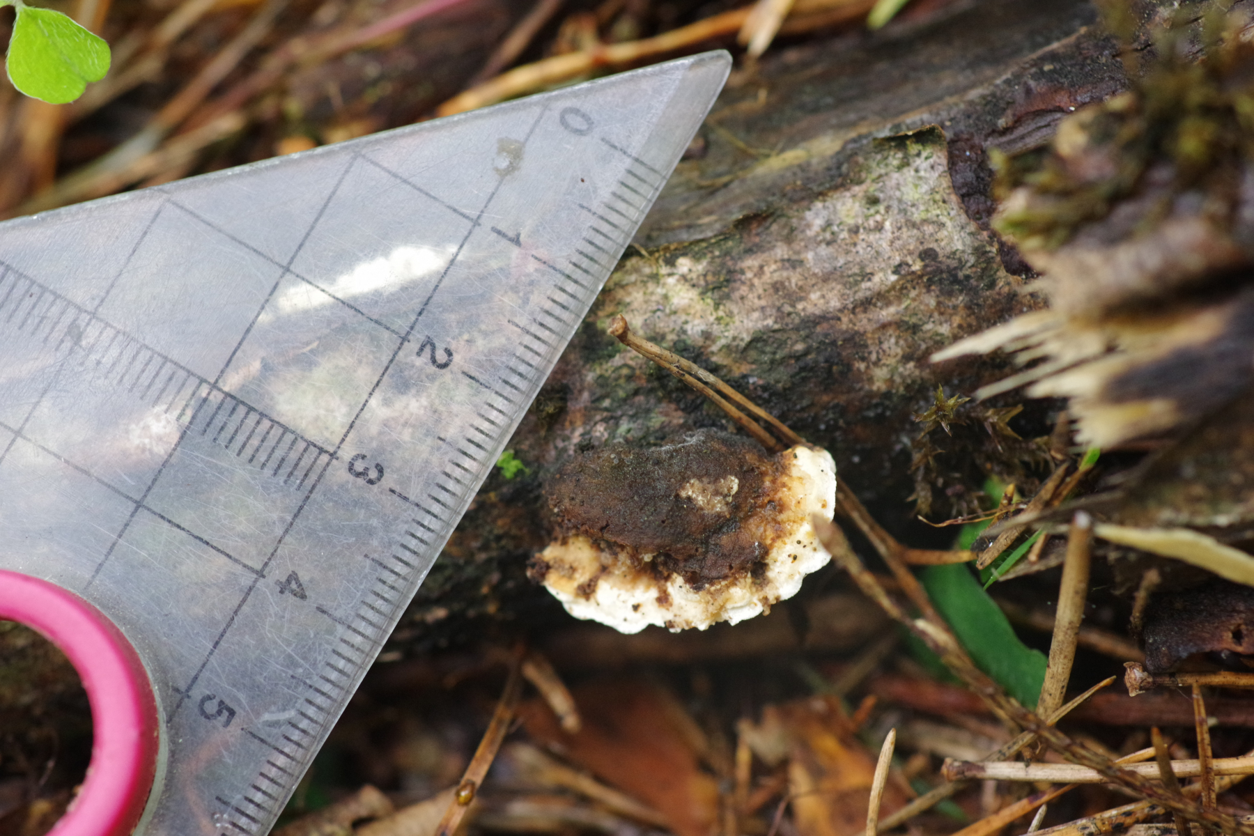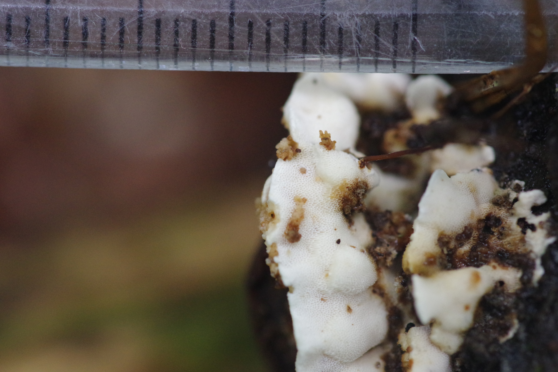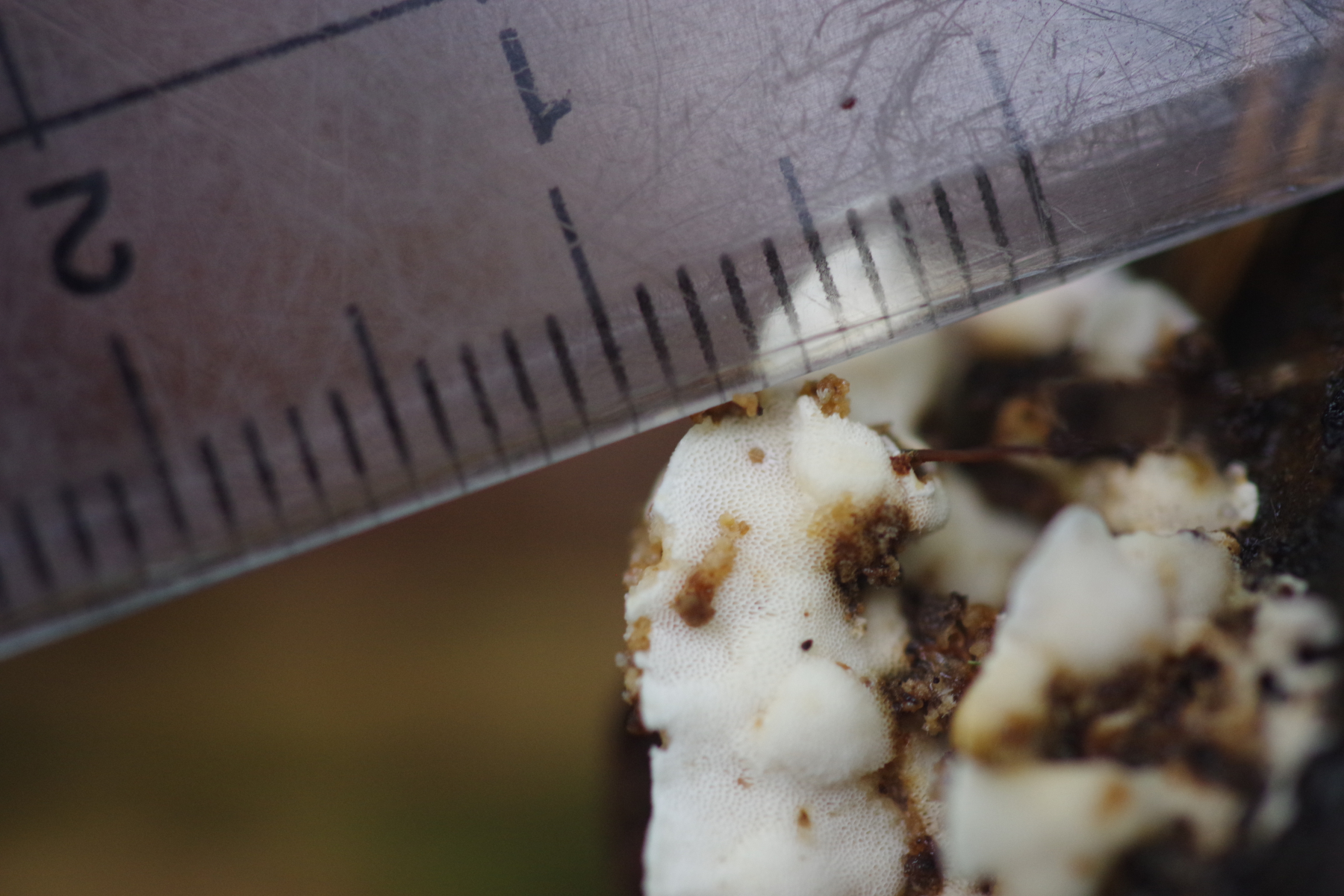 • Hallo allerseits, an einem liegenden, morschen Ebereschenstämmchen wächst dieser Pilz als kleine Konsole. Besonders auffällig finde ich die sehr feinen Poren, so 5-6 pro mm. Schnitt habe ich noch keinen gemacht, da wie so oft, gleich in der Nähe.