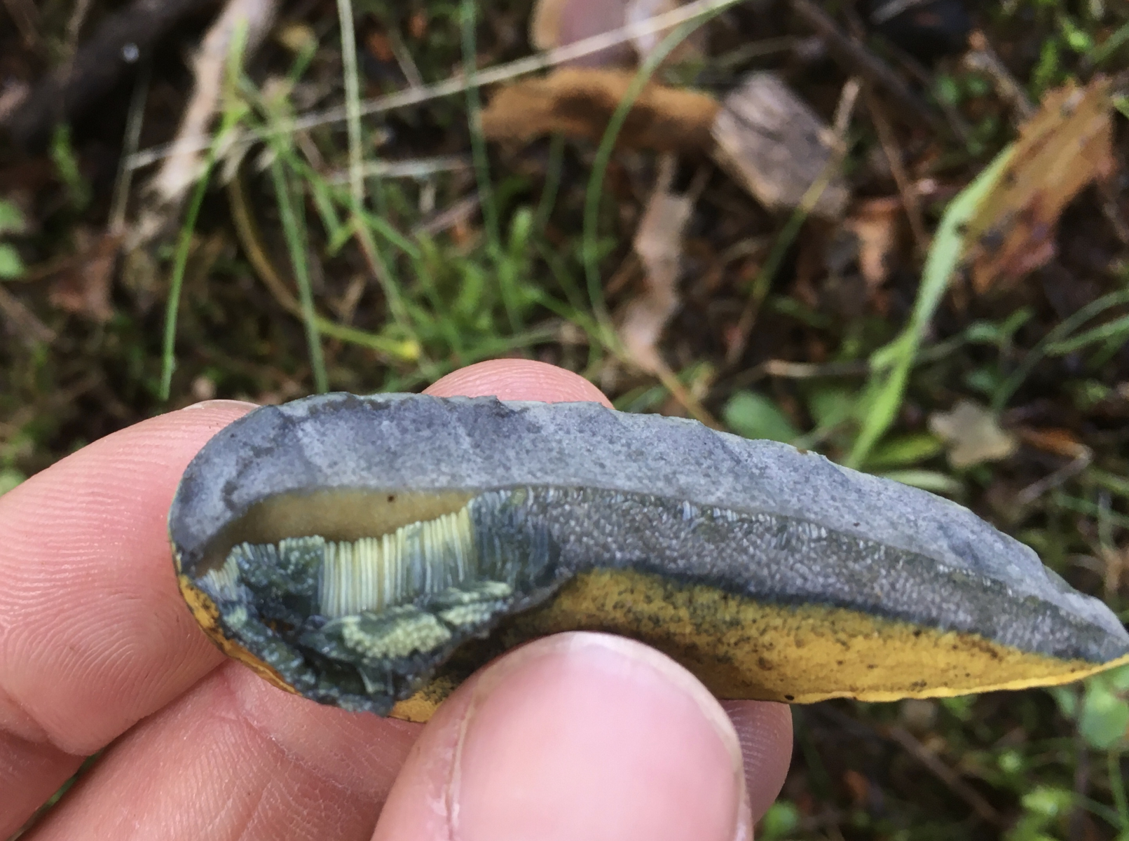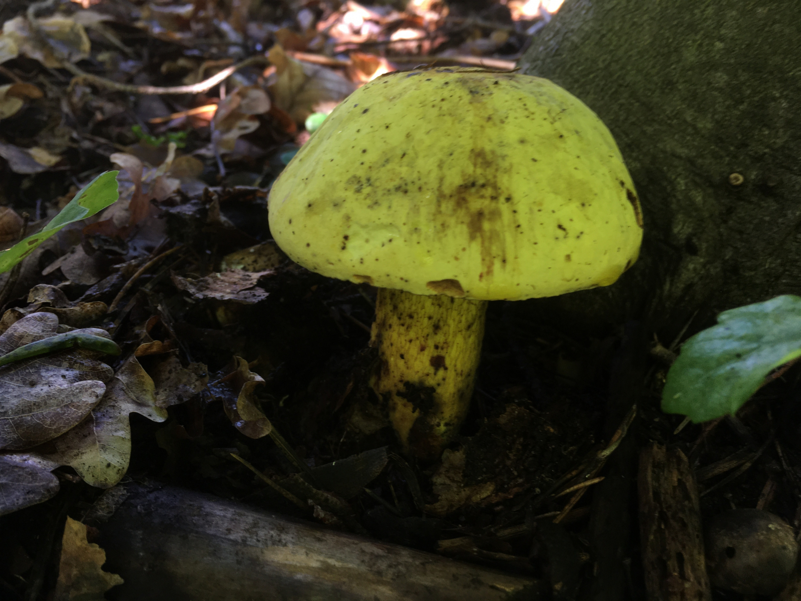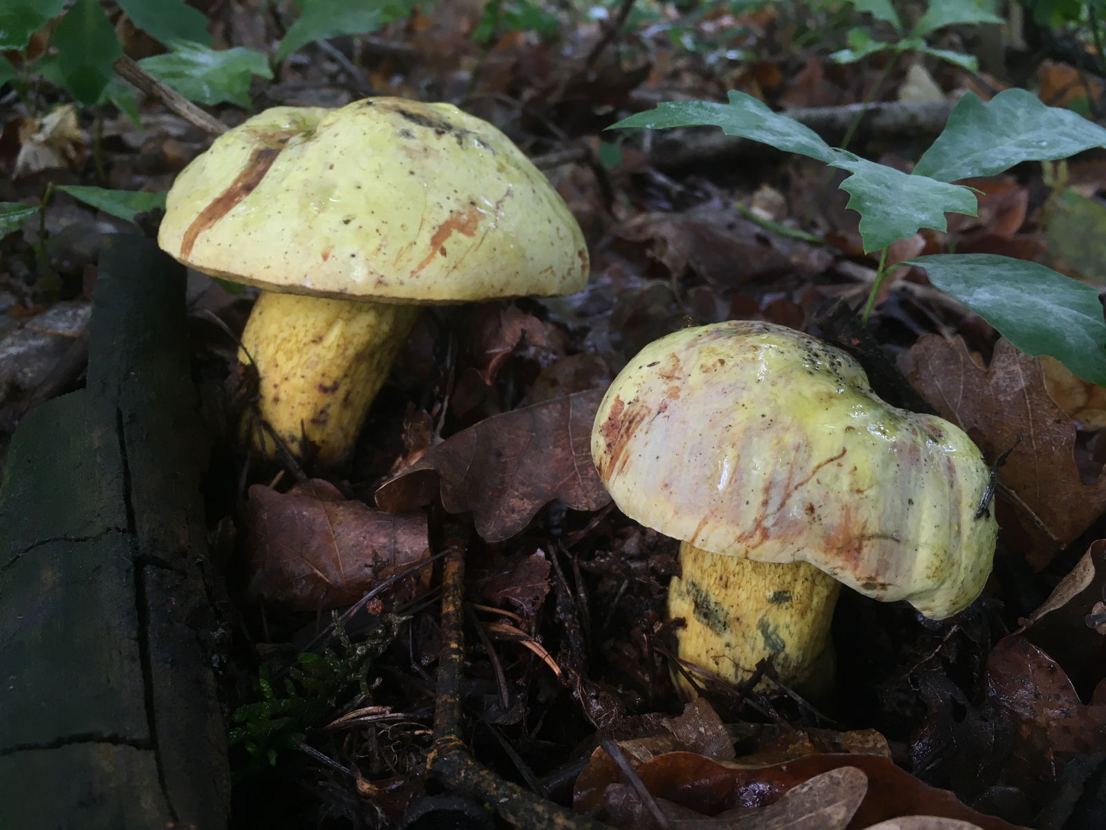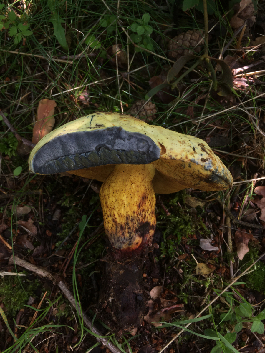 Servus zusammen, unglaublich wie hier gerade alles explodiert, obwohl ich kaum Zeit habe raus zugehen, finde ich doch fast täglich irgendwas an der Bushalte oder im Hinterhof. Den habe ich gerade am Raucherplatz unter Eiche gefunden. Oder er mich, so quitschegelb wie er daherstrahlt. Zuerst dachte ich an was "besseres" wegen dem leicht rosa behauchten Hut des rechten. Aber aufgrund Netz und heftigen Blauens vermute ich doch nur eine etwas gelb geratene Netzhexe? oder geht das noch als Normalversion durch? bis ich ihn berührt hab war er tatsächlich komlpett gelb von Kopf bis Fuß, inklusive Röhren... aber ehrlicherweise hatte noch nicht so viele Hexen, auch wenn sie wohl anderswo Massenpilze sind...