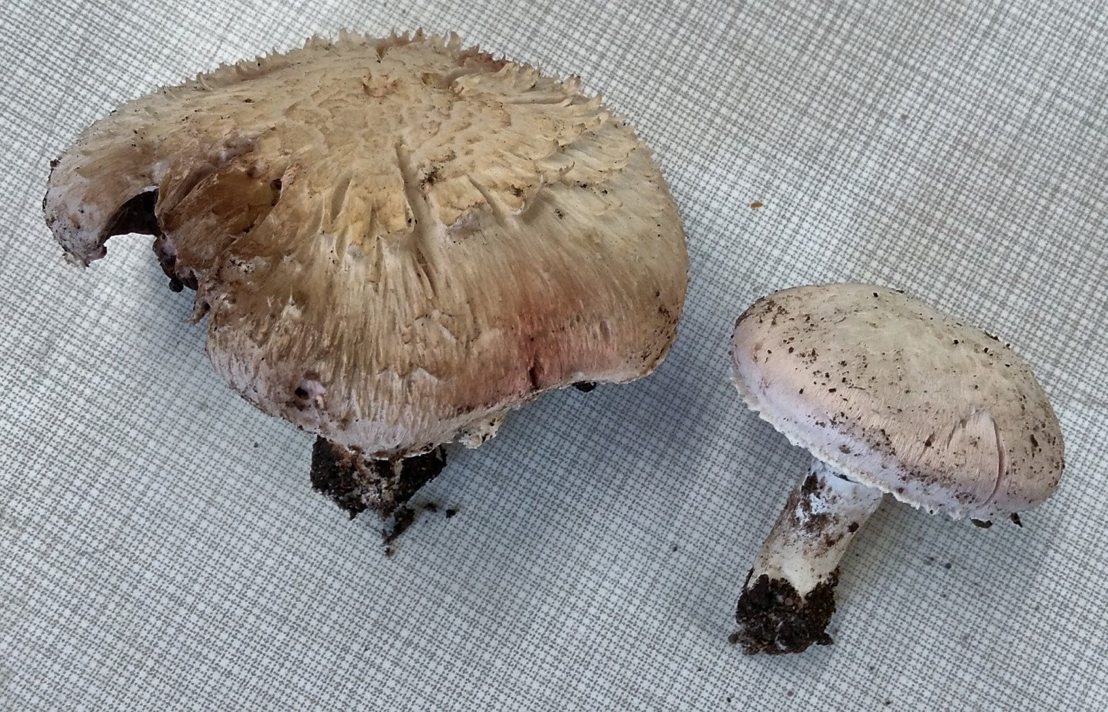 Hier, mit der Lamellenfarbe, der zylindrischen, nicht verdickten Stielbasis, dem schütteren ring und der Punkerfrisur würde ich als erstes an Wiesenchampis (agaricus campestris) denken.