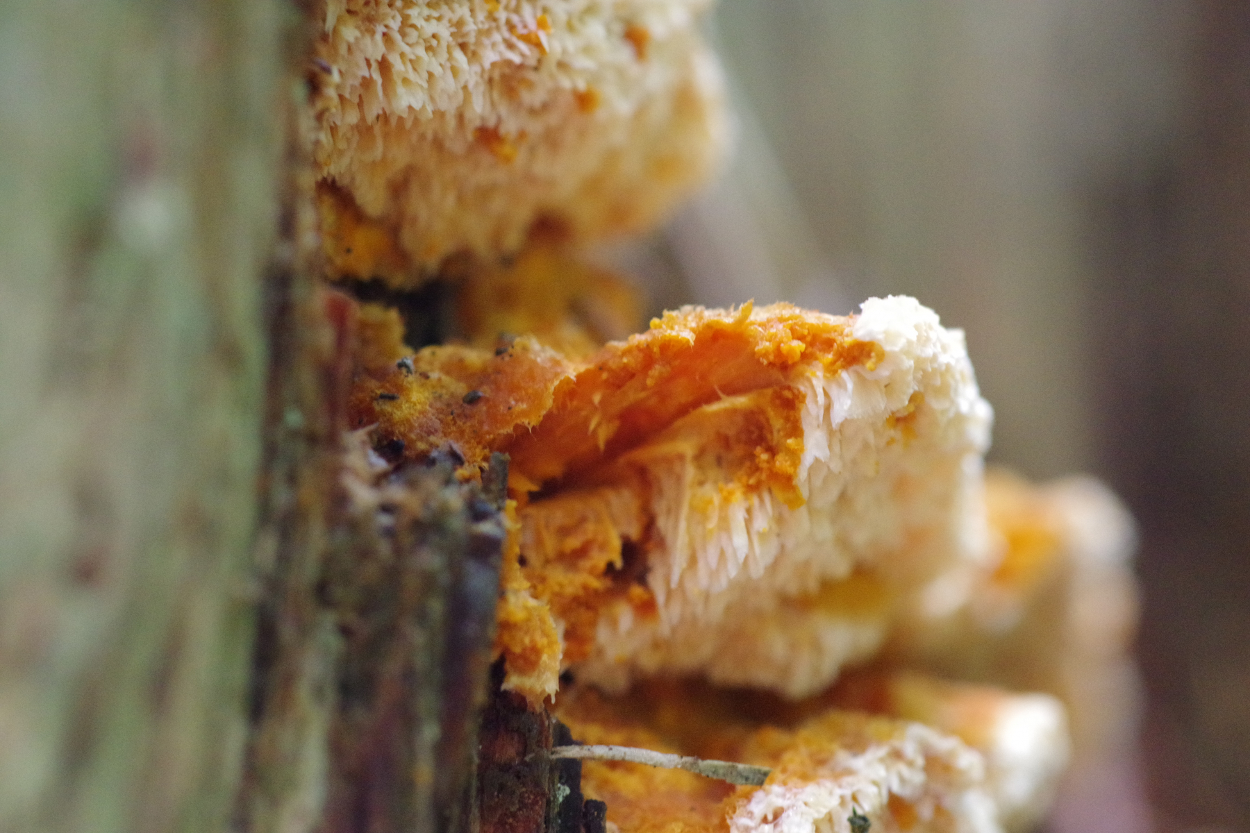 Bei dem orangen Porling habe ich jetzt ein Vergleichsbild mit weiß und postgelb gemacht. Bei voller Sonne gibt es unter dem Blätterdach immer einen Grünstich und bisher habe ich noch keine Einstellung beim Weißabgleich gefunden, die das gut korrigiert. Die Poren sind schon ziemlich groß, das wird wohl bei P. fulgens enden.