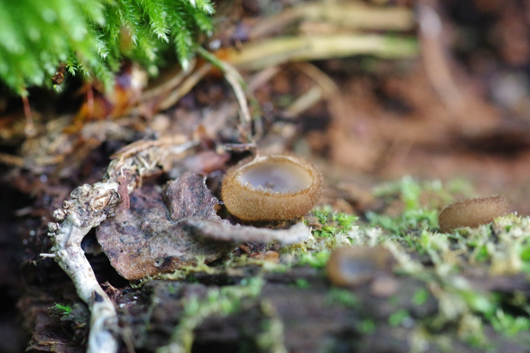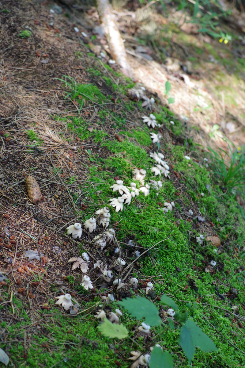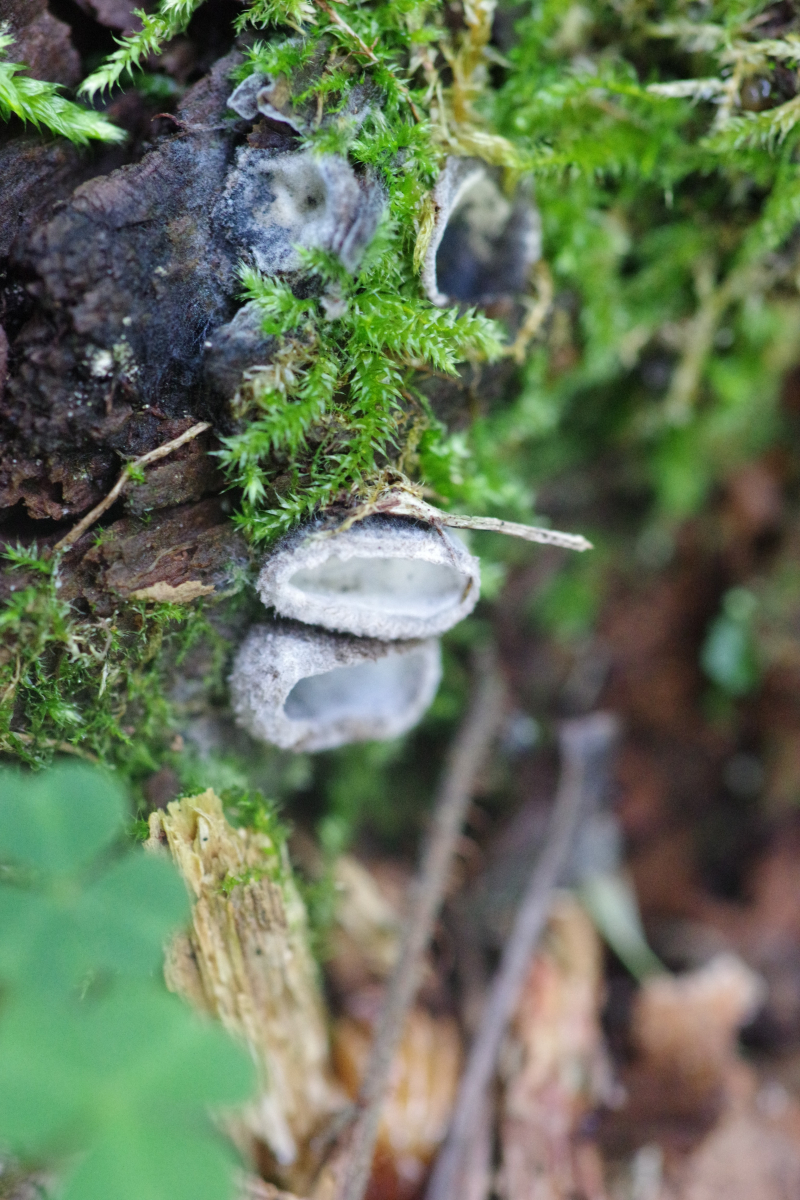 4) gleich neben dem schon oft gezeigten Plectania melastoma, der immer noch in Form ist, diese Becher, die wie Humaria hemisphaerica aussehen. Einige in weiß, was sich möglicherweise mit dem in der Wikipedia genannten Hypomyces stephanomatis in Verbindung bringen lässt.