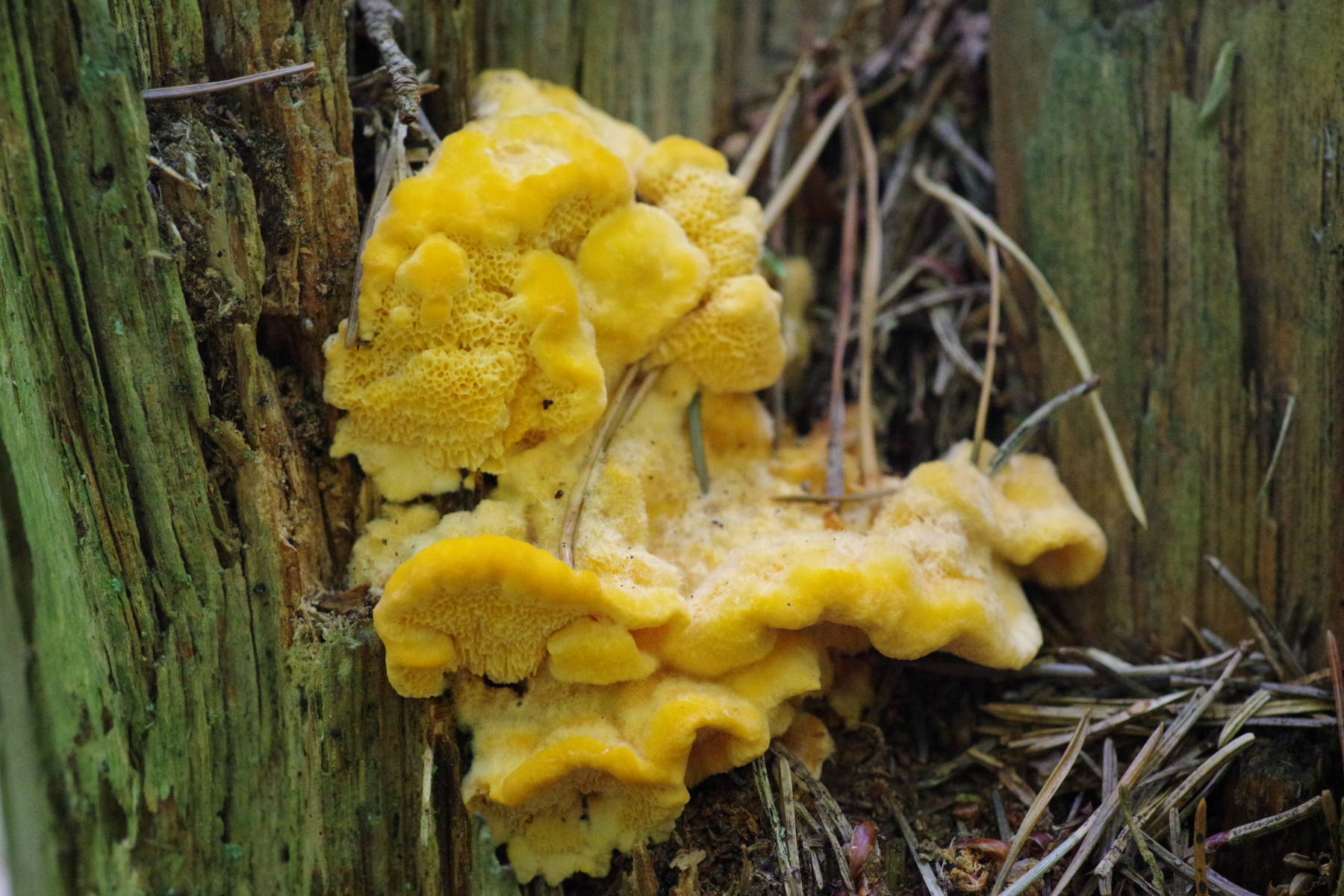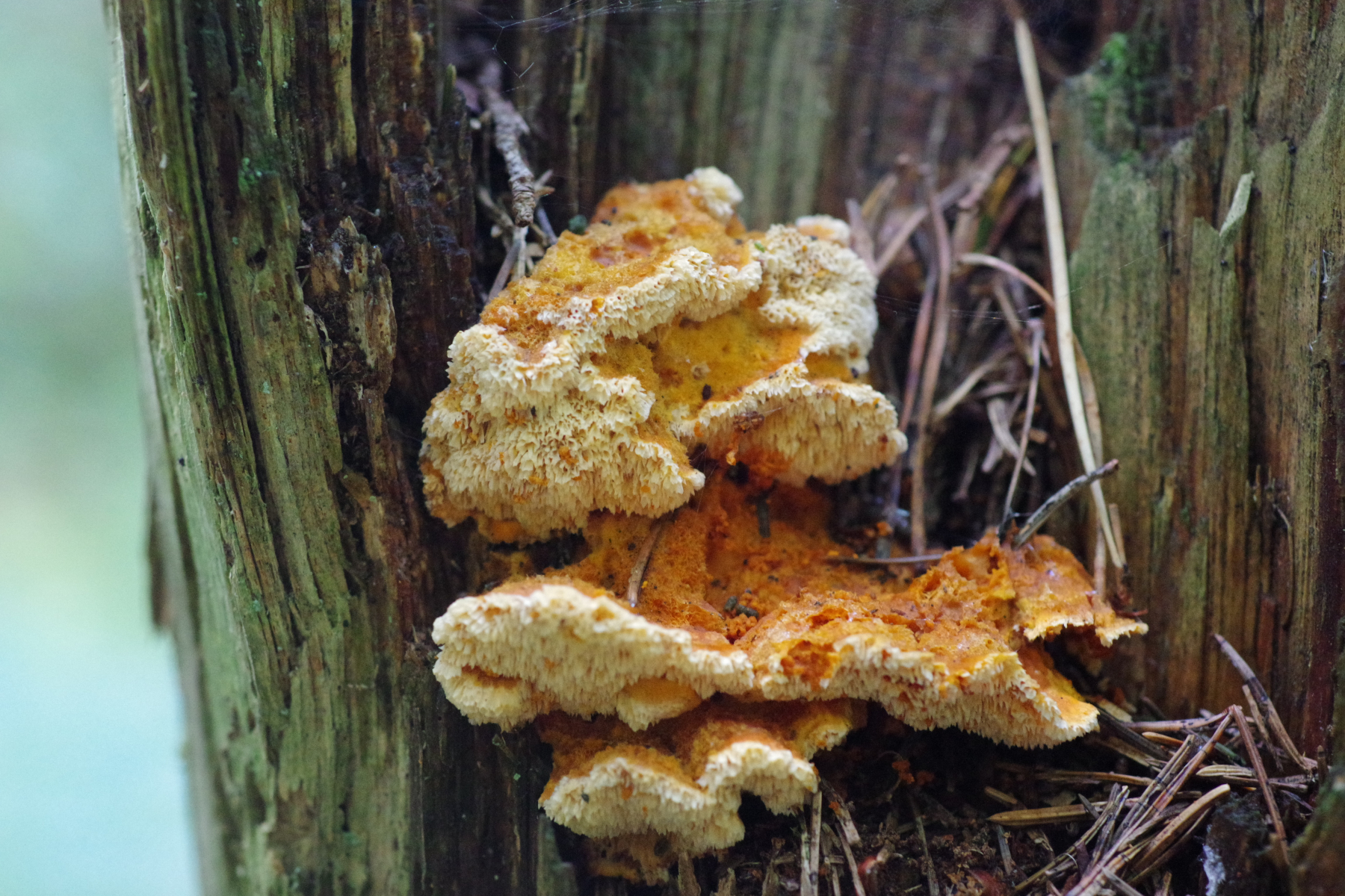 Pycnoporellus fulgens kenne ich normalerweise bei so jungen fruchtkörpern kräftiger orange, teils fast orangerot und nicht so gelb.