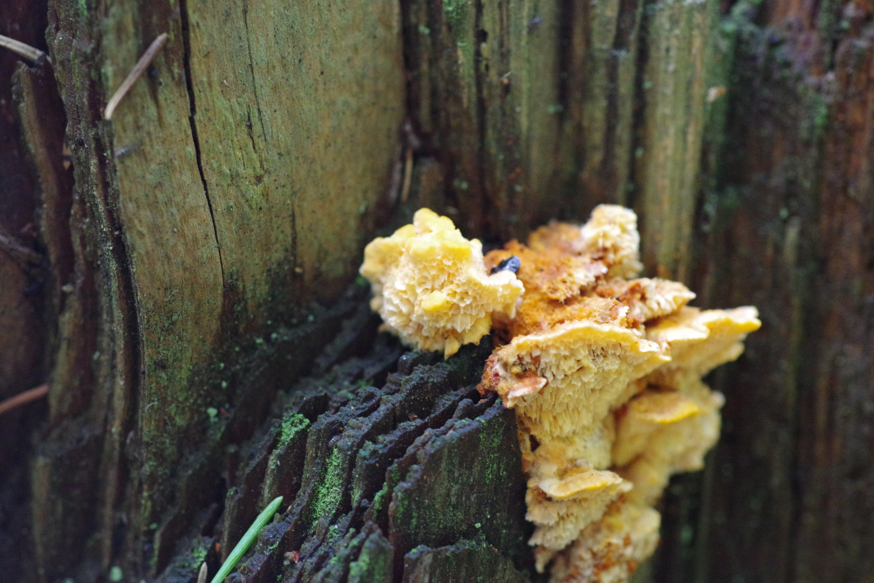 Bei dem orangen Porling habe ich jetzt ein Vergleichsbild mit weiß und postgelb gemacht. Bei voller Sonne gibt es unter dem Blätterdach immer einen Grünstich und bisher habe ich noch keine Einstellung beim Weißabgleich gefunden, die das gut korrigiert. Die Poren sind schon ziemlich groß, das wird wohl bei P. fulgens enden.