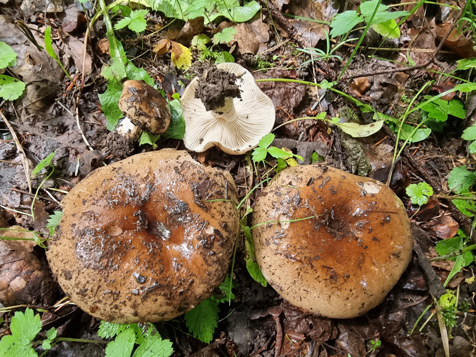 den zweiten Täubling solltest du mal mit R. acrifolia vergleichen, falls da auch Laubbäume am Standort waren. Die rötet manchmal nur schwach, bevor sie schwärzt. R. anthracina kenne ich aus Bayern nur in der var. insipida mit mildem Geschmack, viel düstereren Hutfarben und viel stärker schwärzend. Die warm braunen Hutfarben und die im Zentrum speckig glänzende und auch etwas klebrige Huthaut wären typisch für R. acrifolia.