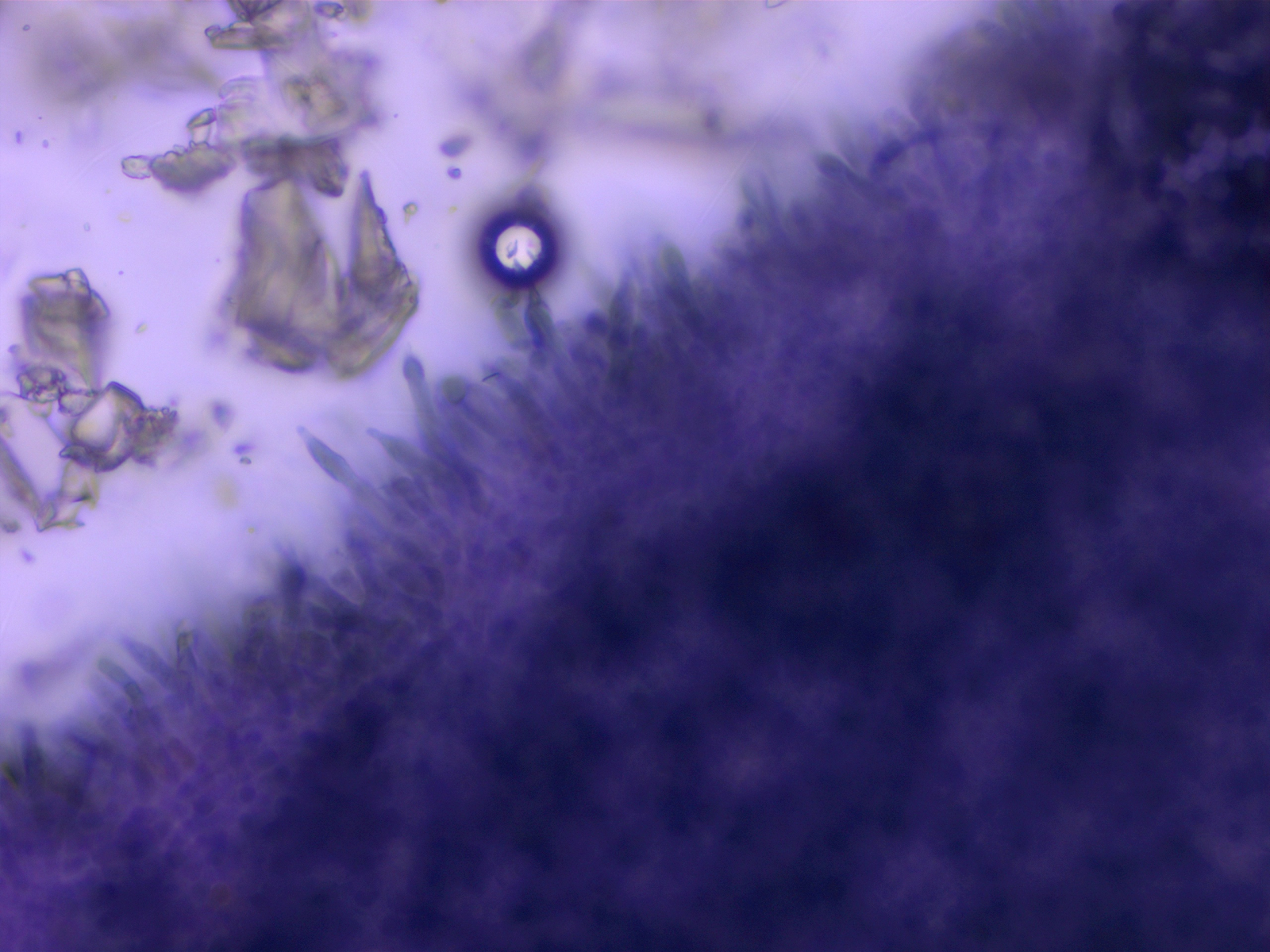 Hymenialzystiden in Kongorot, um 60 µm lang.