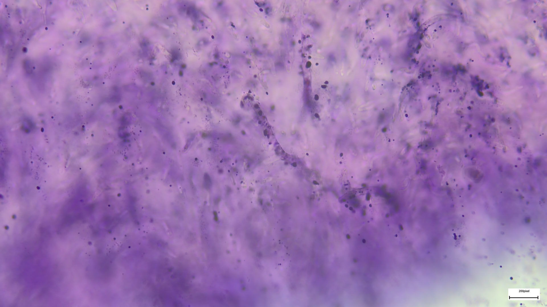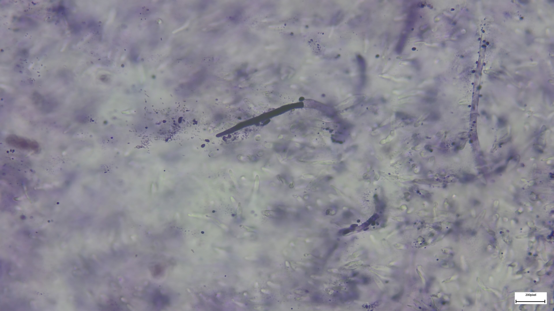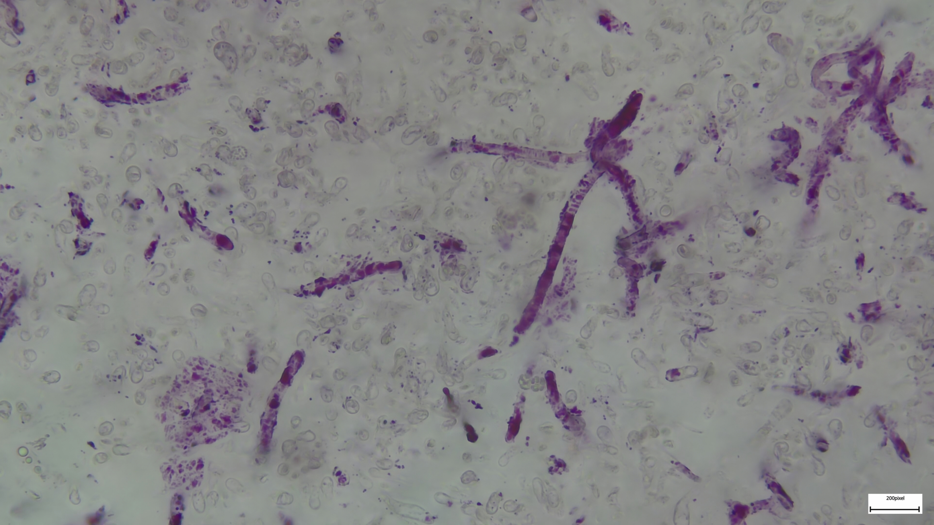 HDS mit inkrustierten Primordialhyphen in Karbolfuchsin, manchmal ganze Hyphenendzellen recht schwarz werdend (?):