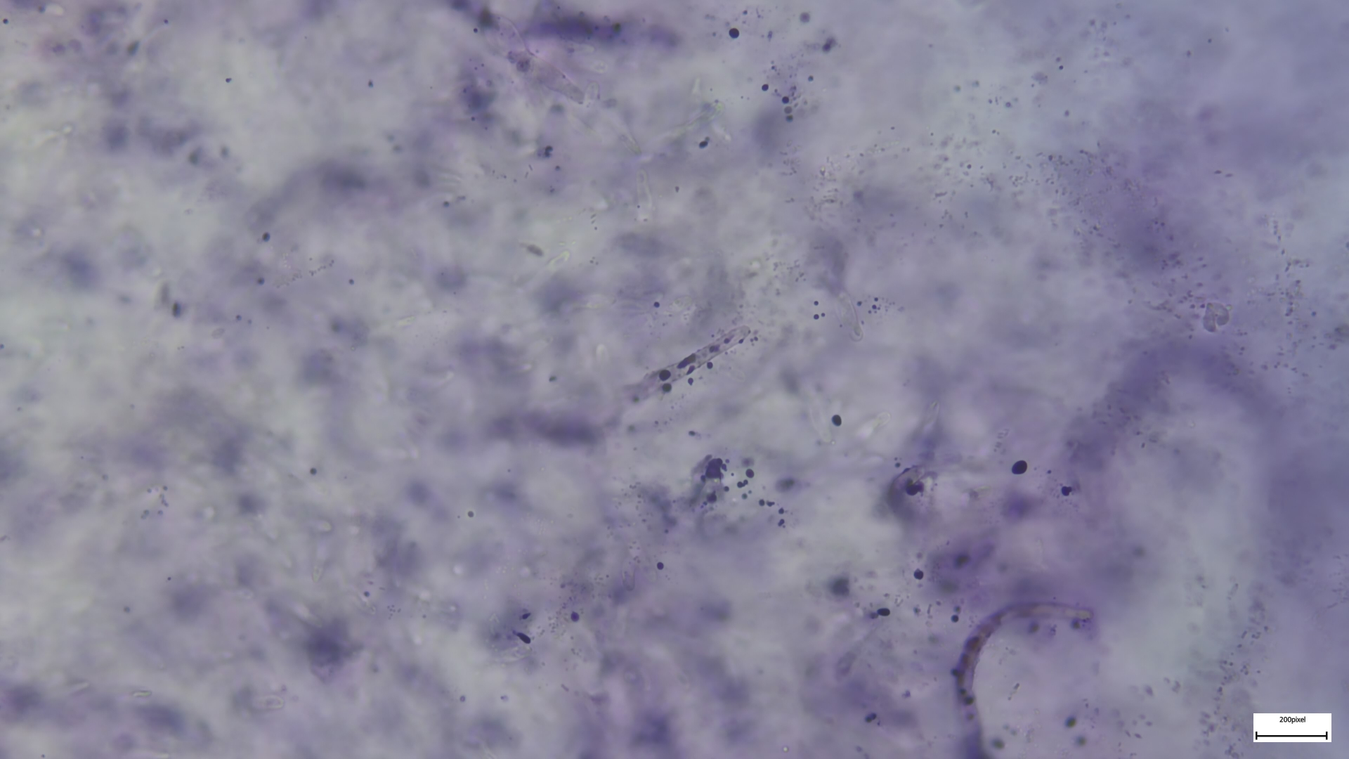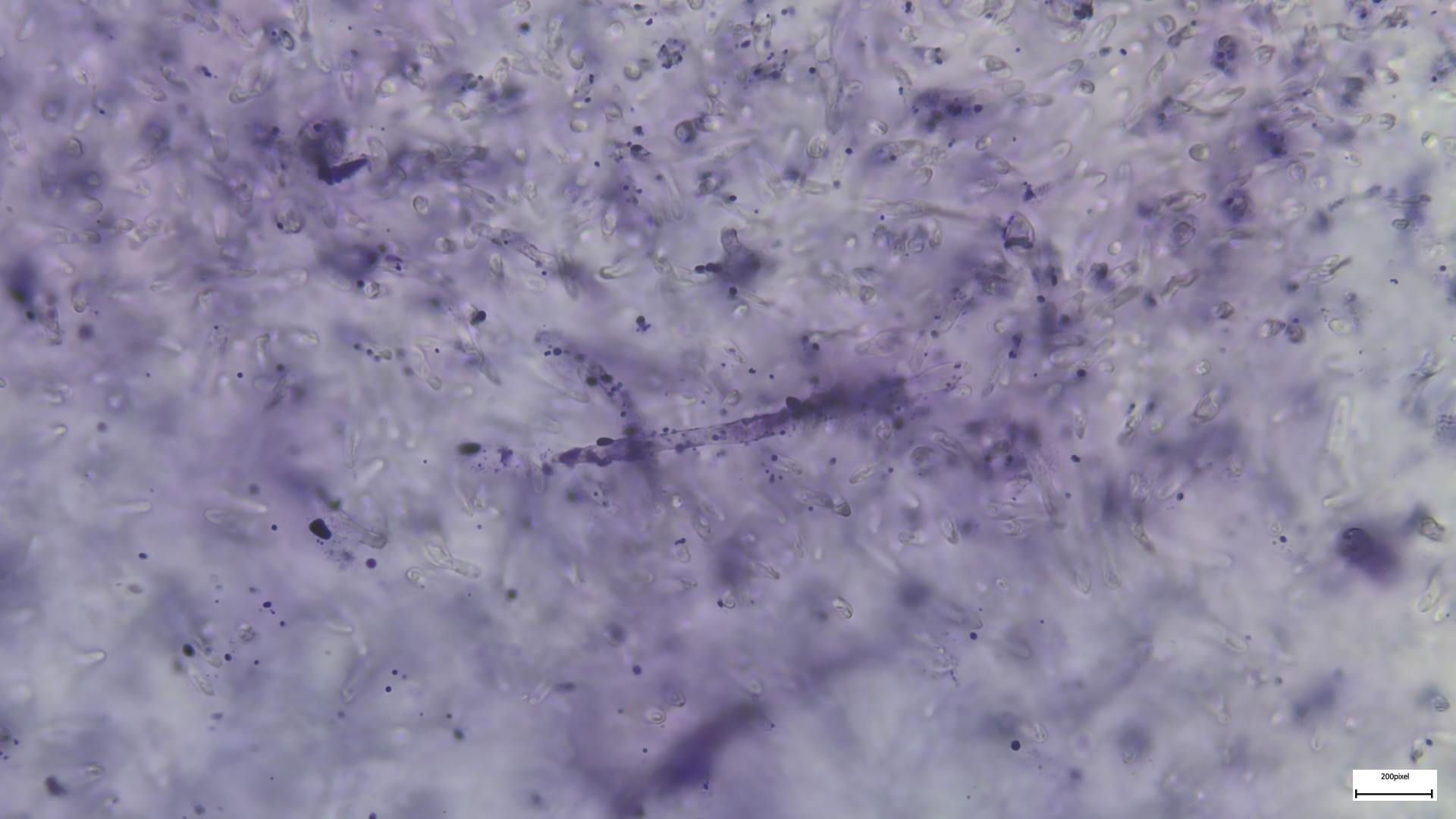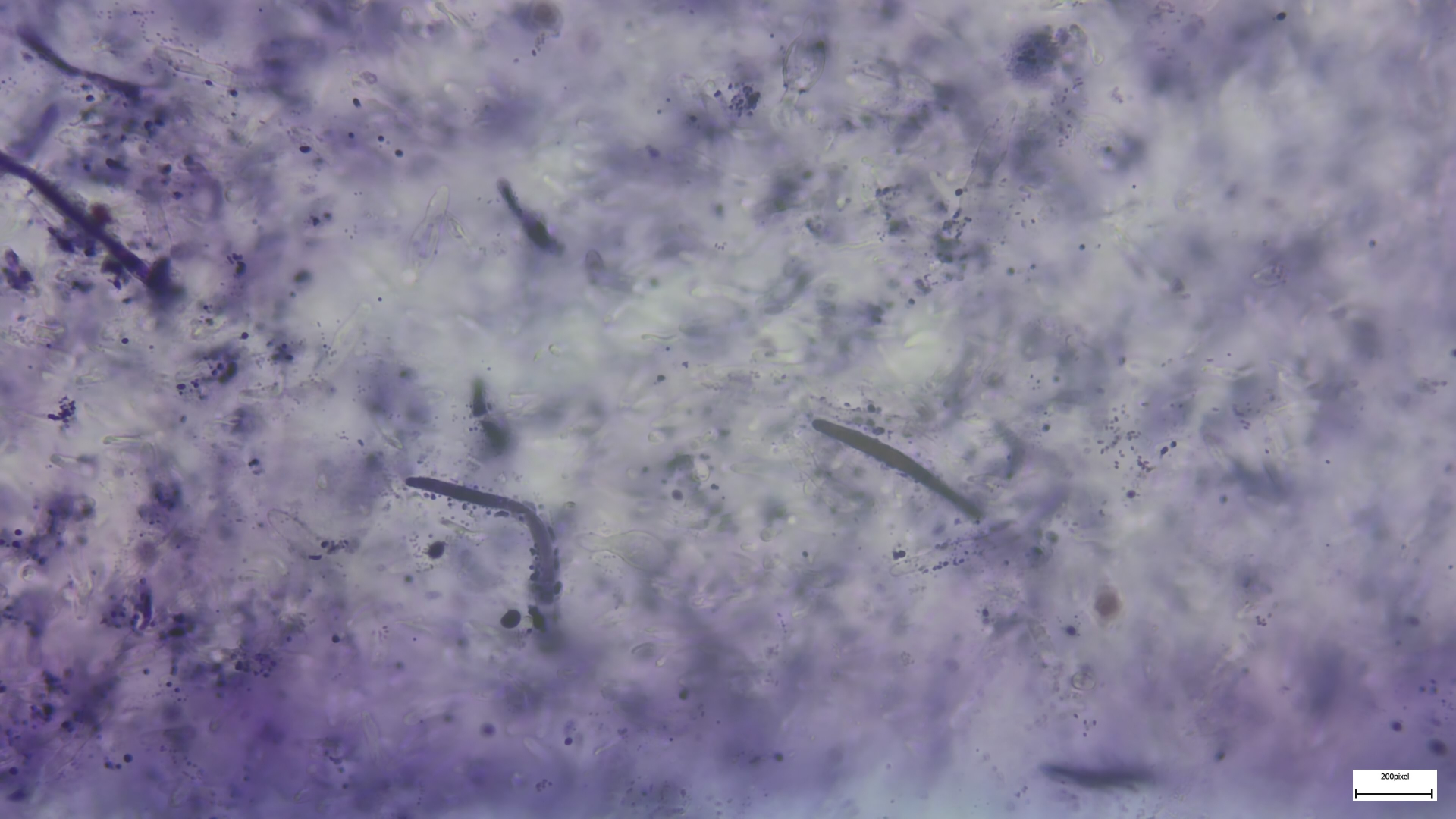 HDS mit inkrustierten Primordialhyphen in Karbolfuchsin, manchmal ganze Hyphenendzellen recht schwarz werdend (?):