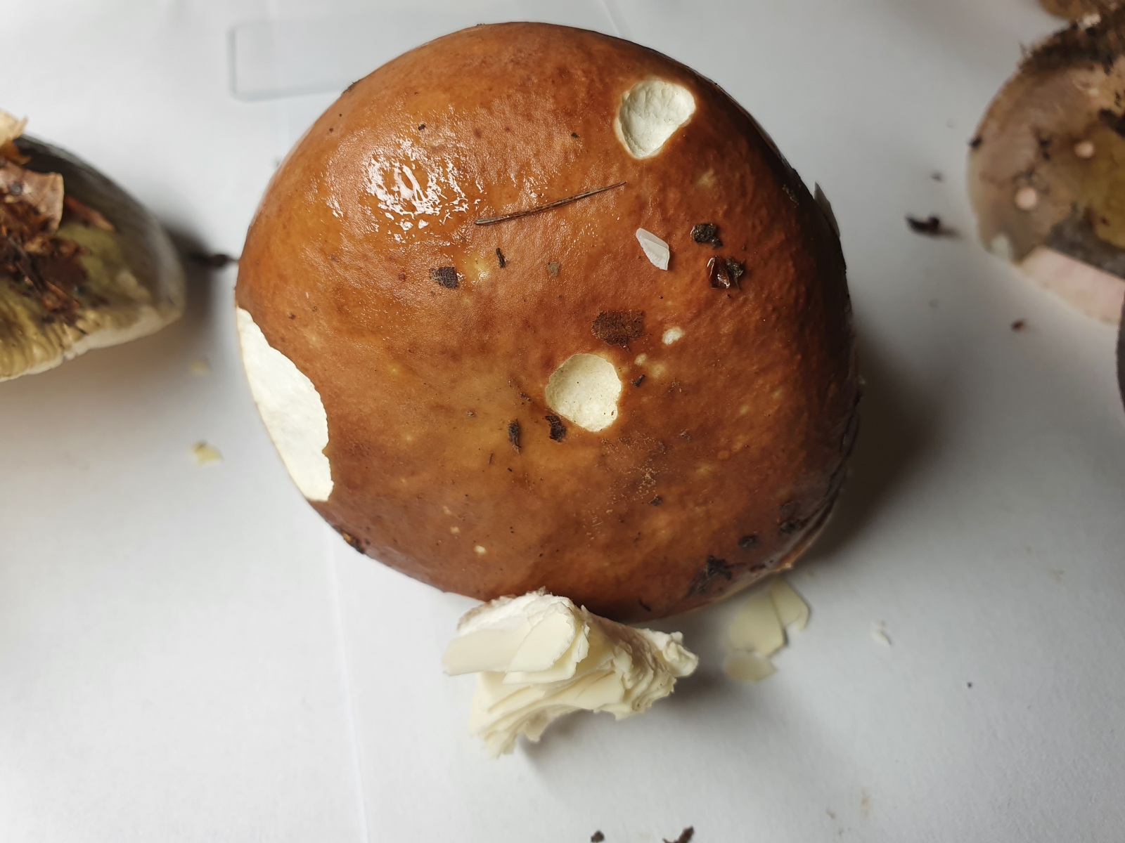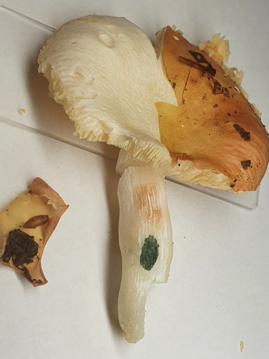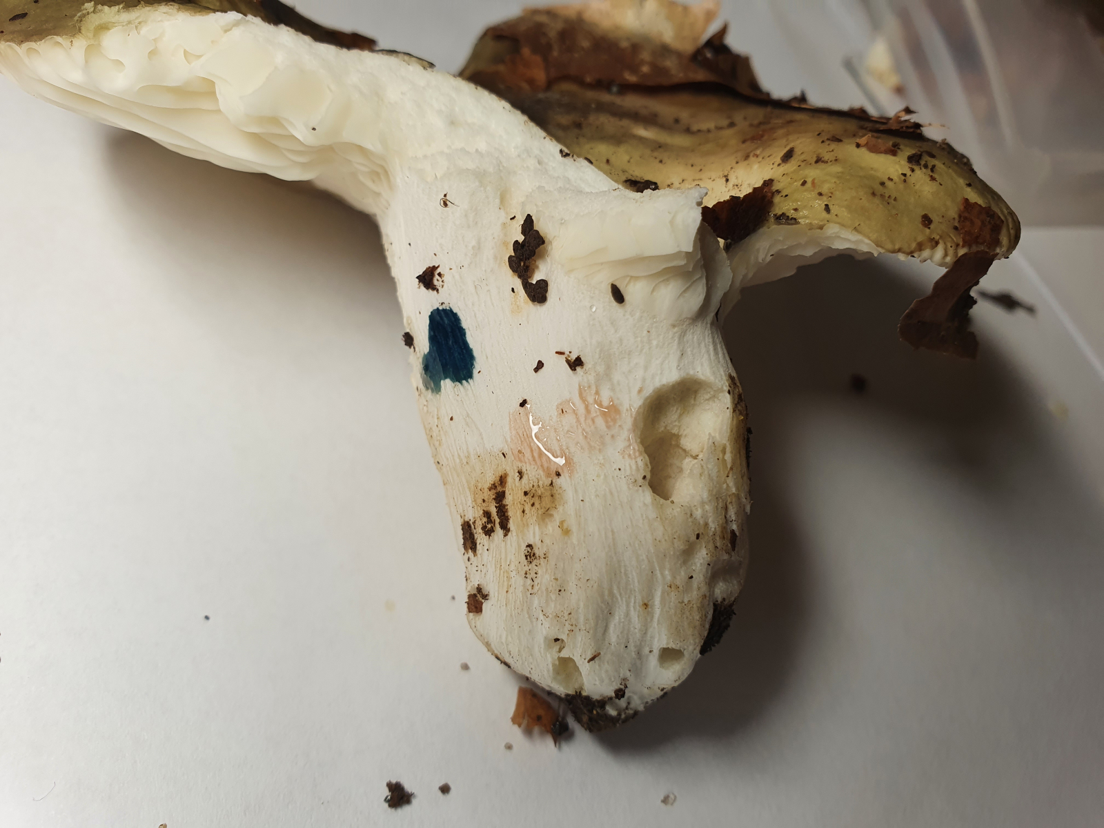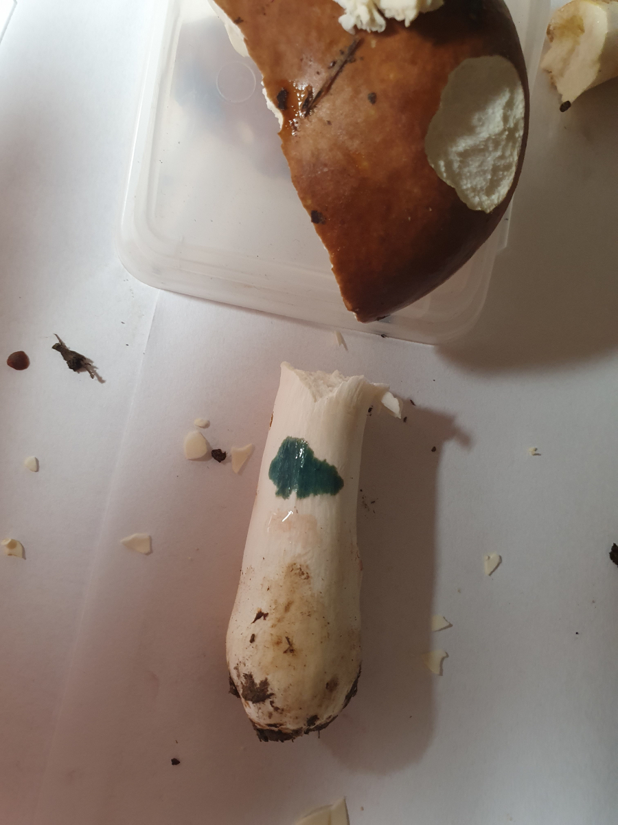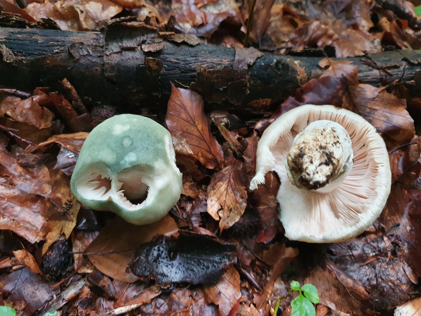 Das nächste sollte wahrscheinlich Russula aeruginea sein (Huthaut habe ich mir aus Zeitgründen nicht angeschaut). Mild im Geschmack.