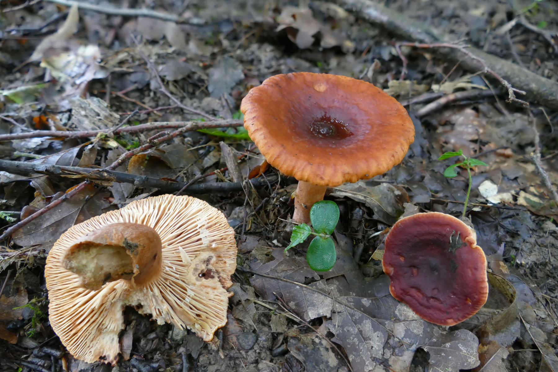 Spannend fand ich den folgenden Milchling. Erst dachte ich wegen der orangenen Farben, es könnte sich um weitere Fruchtkörper von L.volemus handeln. Dem war aber nicht so. Milch nur spärlich und eher wässrig, Hüte auch (vorallem jung) sehr dunkel, später etwas ausblassend orangefuchsig, in der Mitte dunkel bleibend, auffallend ein deutlich blasser Hutrand, teils kerbrandig/gerieft erscheinend bei älteren Exemplaren.