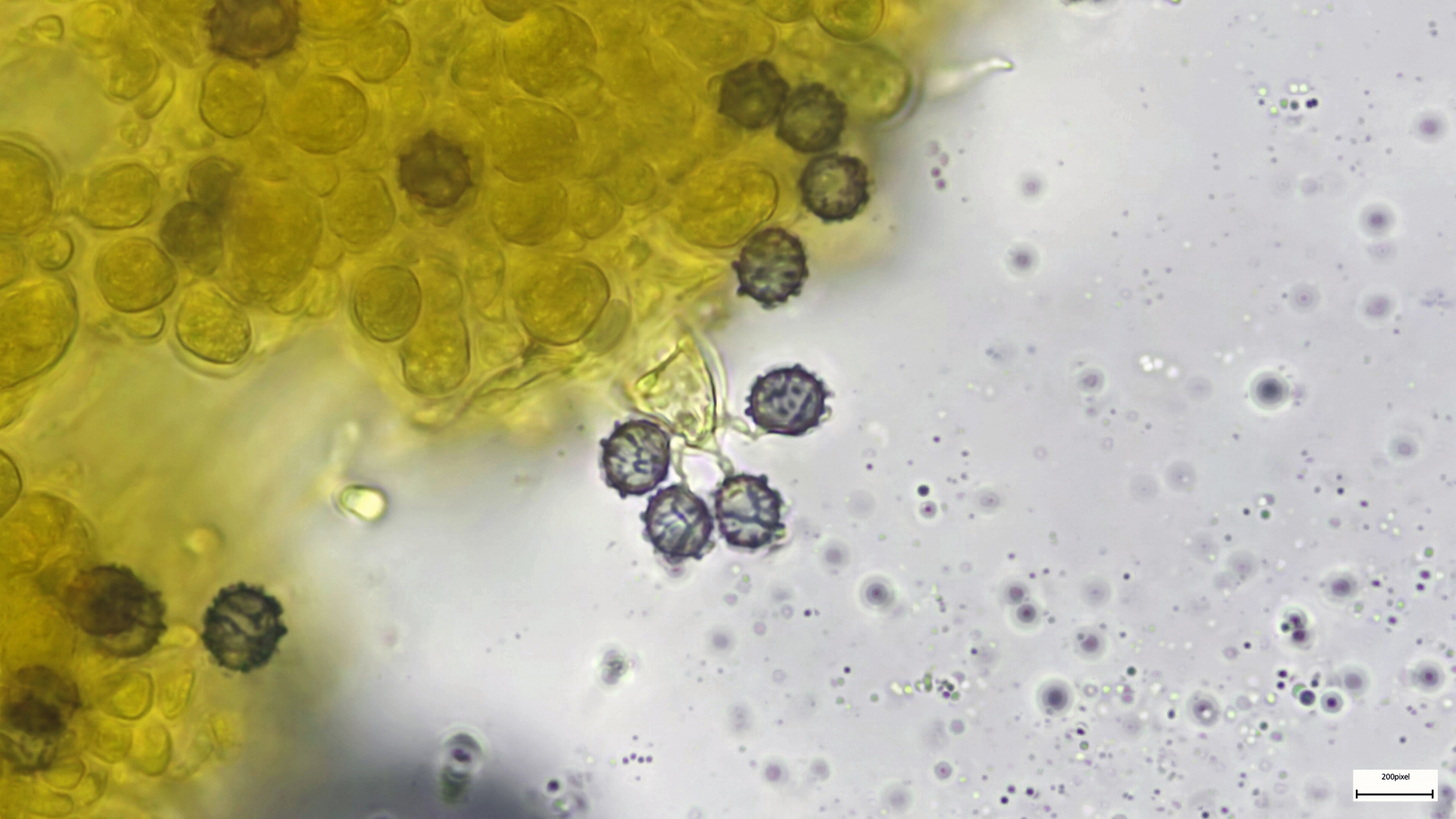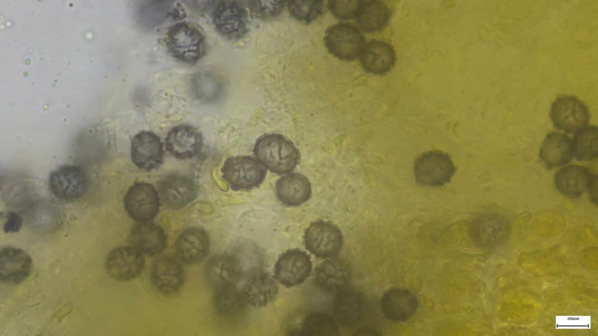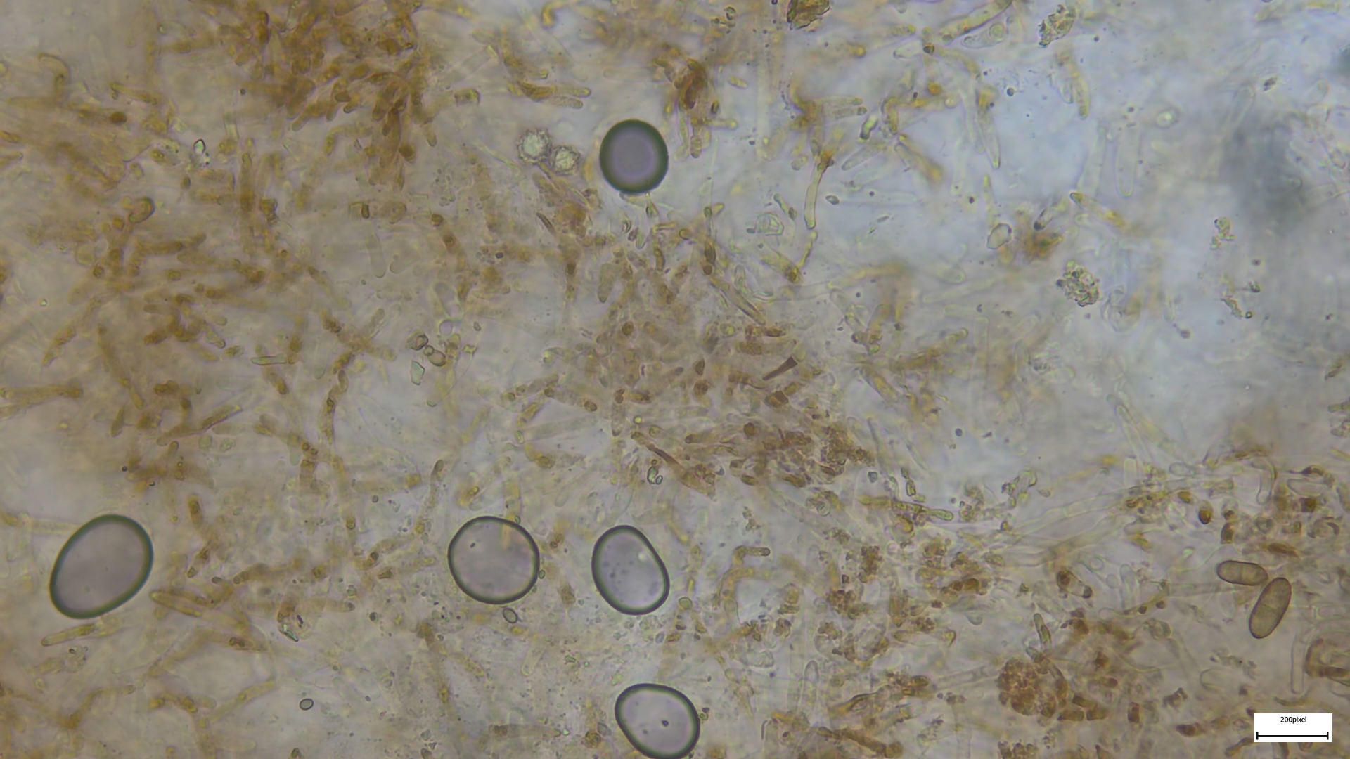Hier habe ich mal das Mikroskop bemüht (Zum aussporen ausgelegt, aber ich wollte jetzt auch nicht ewig warten, daher Sporen auf Lamelle angeschaut, gemessen)