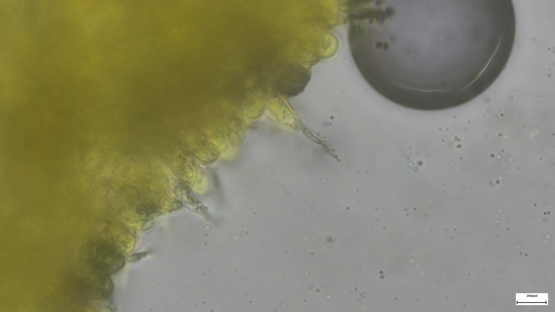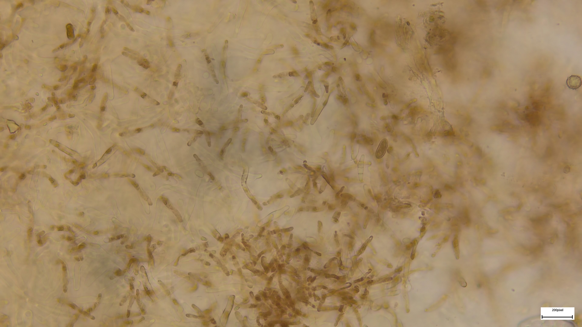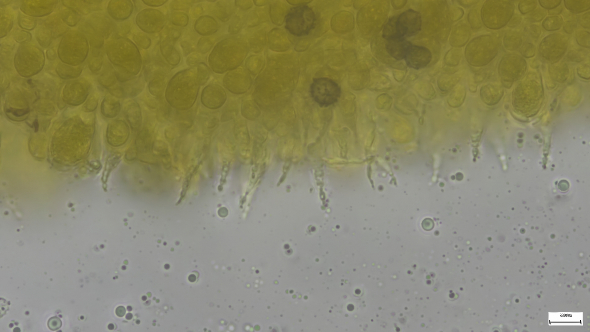 Hutdeckschicht rein hyphig mit Haaren, welche orangebraunes Granulat beinhalten: