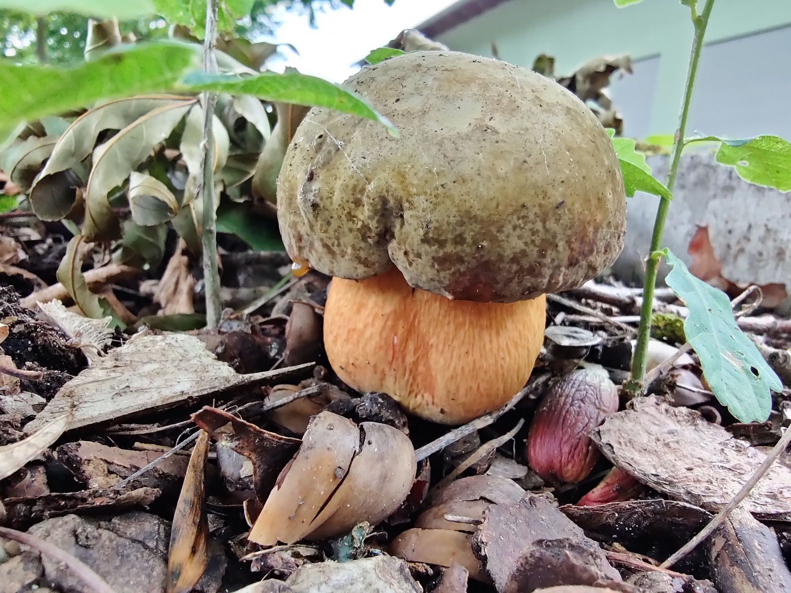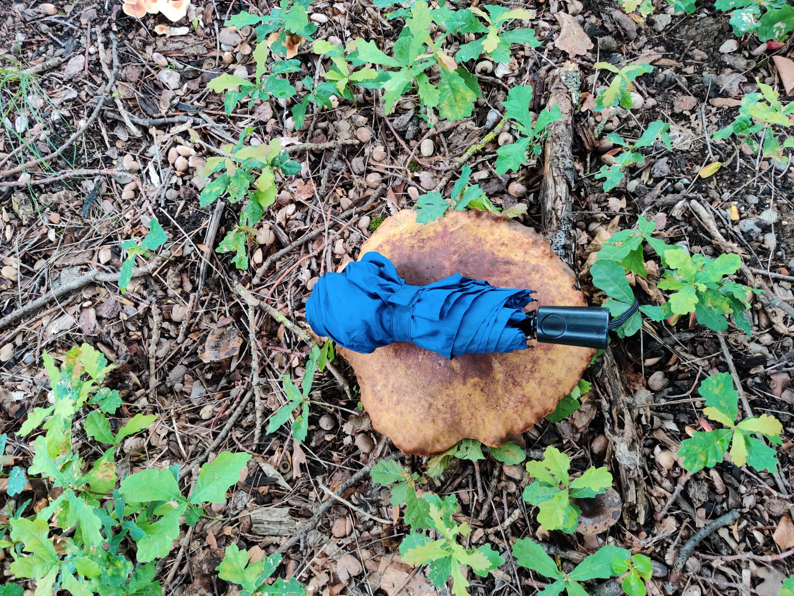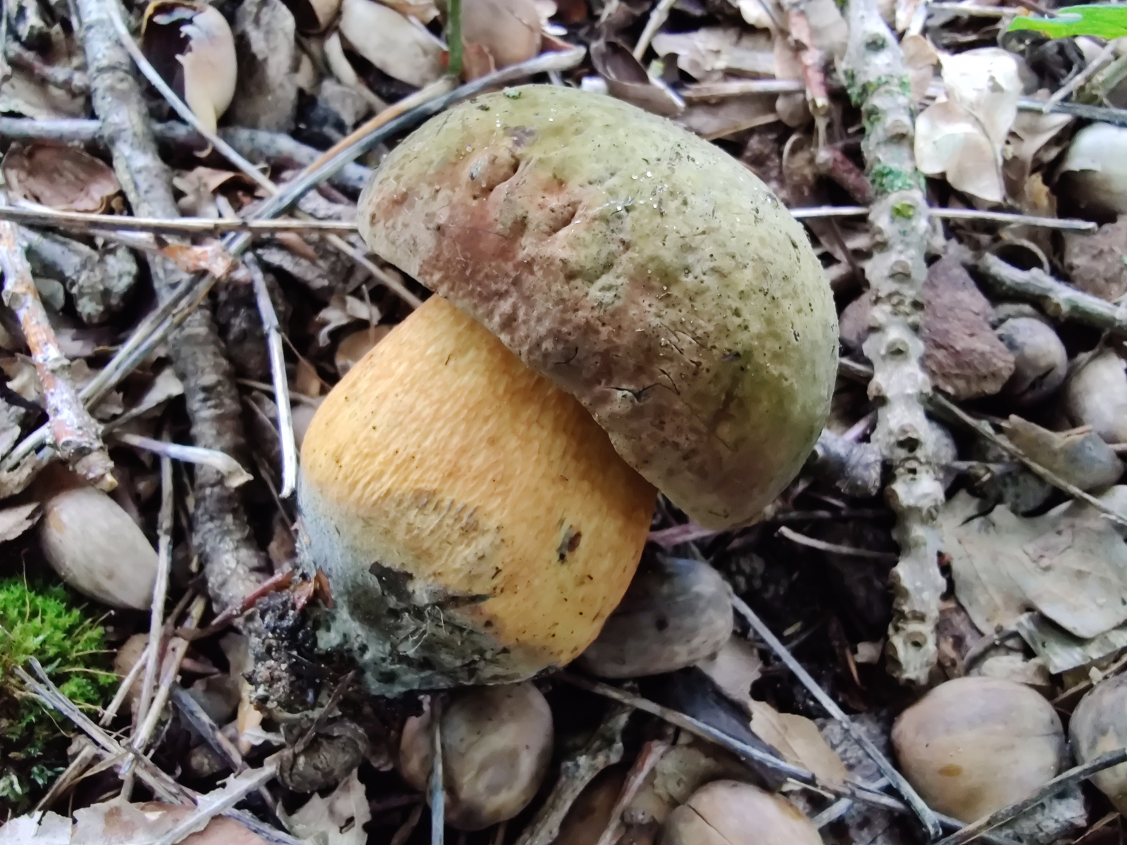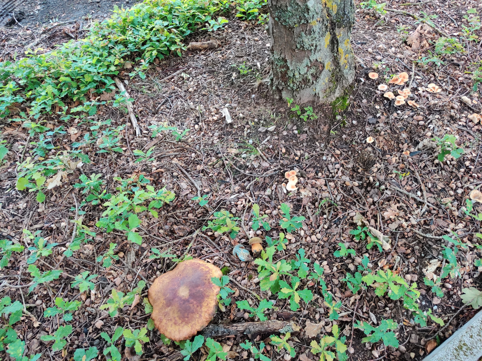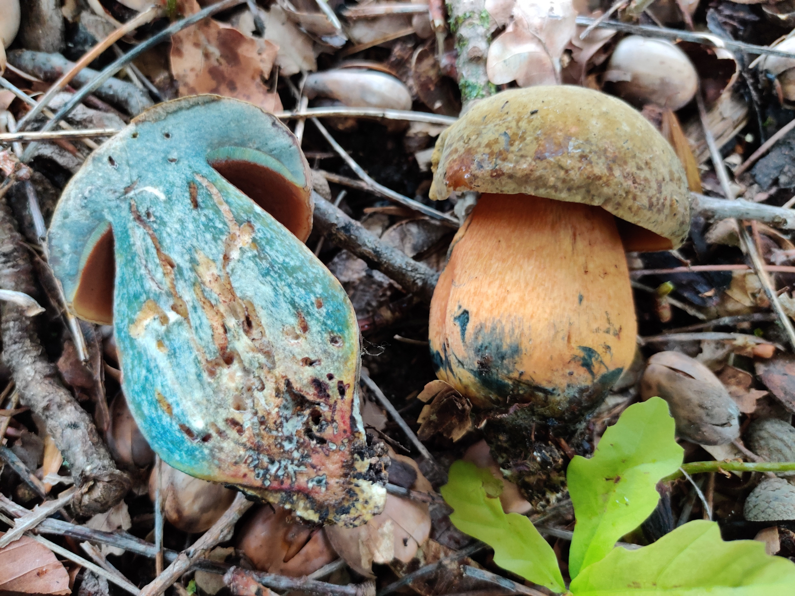 3. Unter Eiche auf einem Parkplatz gab es noch diese Hexenröhrlinge. Wegen der olivgrünen Hutfarbe und des ausschließlich orangenen Stiels des kleinen Exemplars war ich erst etwas verunsichert. Das sollten aber normale Netzstielige Hexenröhrlinge sein, oder? Unglaublich war die Größe des älteren Exemplars, der Hut hatte locker 25 cm im Durchmesser, sowas hab ich noch nicht gesehen.