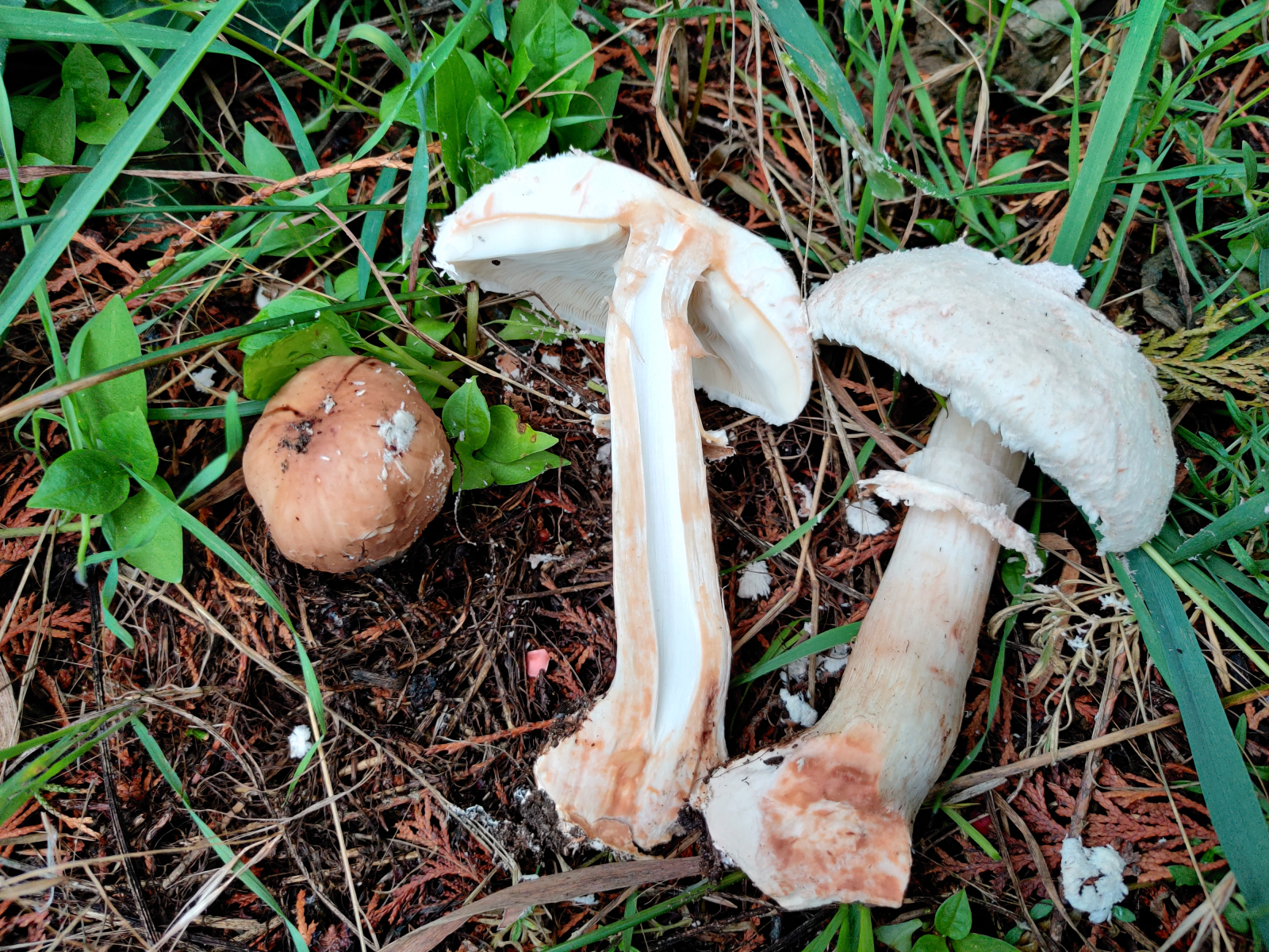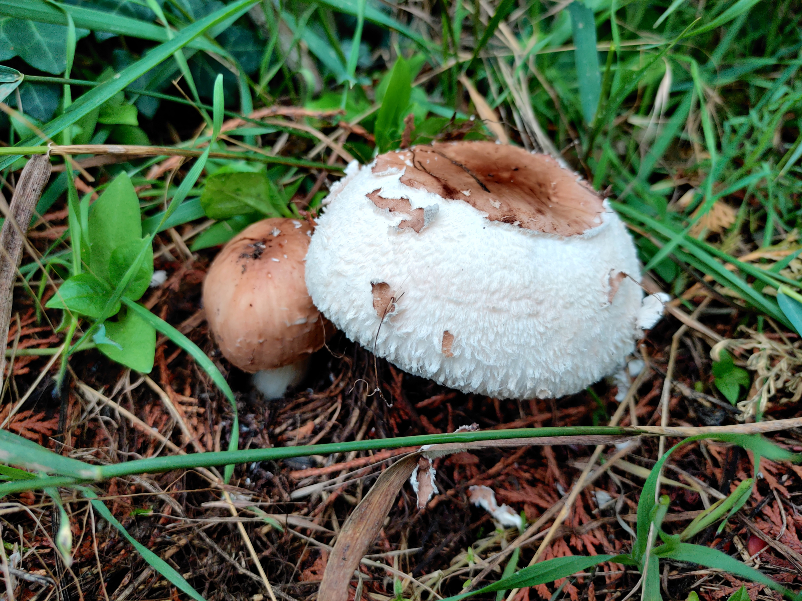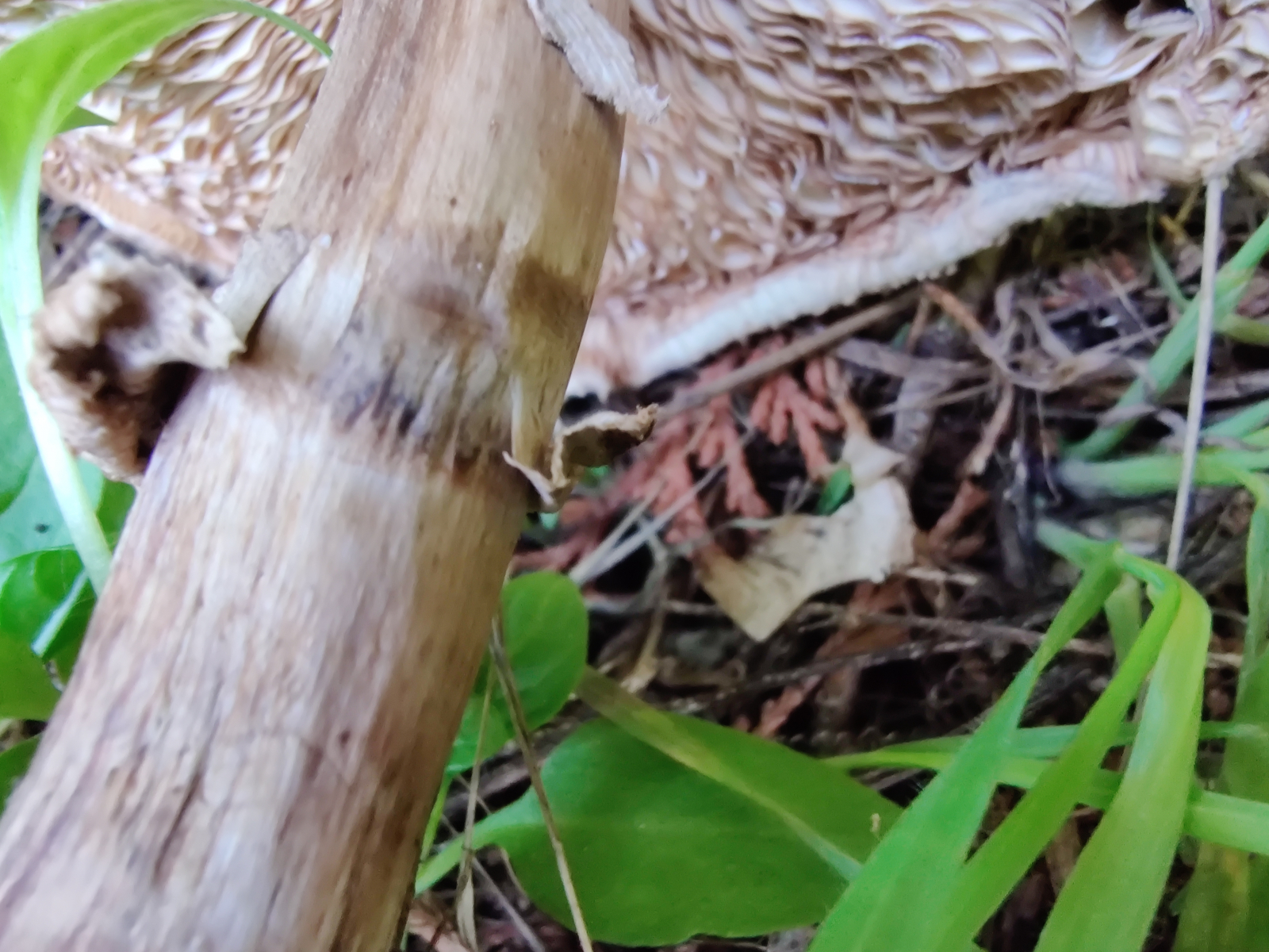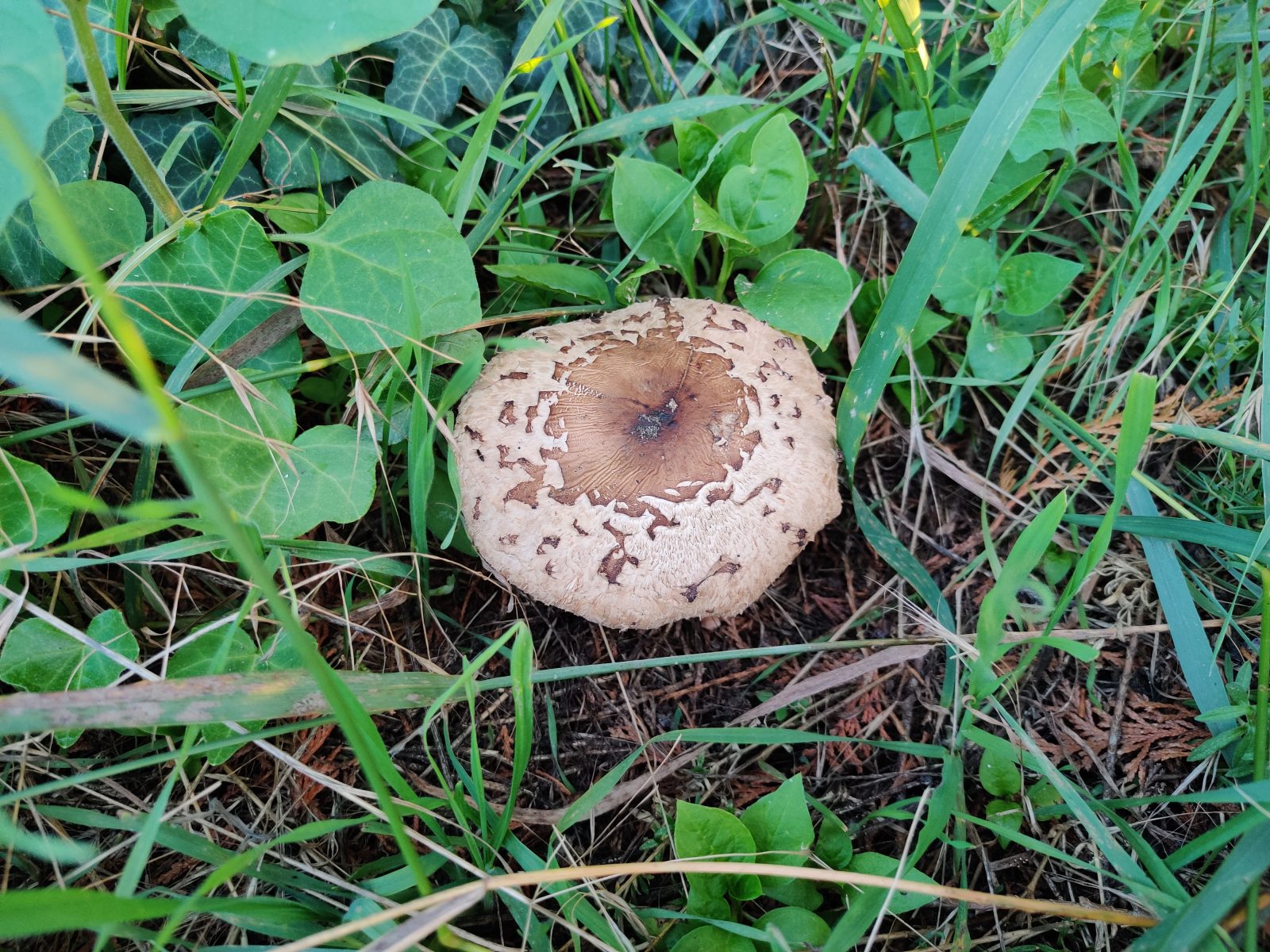 2. Hinter einem Garten fand ich folgende Pilze. Ich bin mir ziemlich sicher, dass es einer aus der Gattung Chlorophyllum ist, bin aber relativ unsicher was die Art angeht. Wegen des einfachen Ringes und der Verfärbung bin ich bei Chlorophyllum brunneum, passt das?
