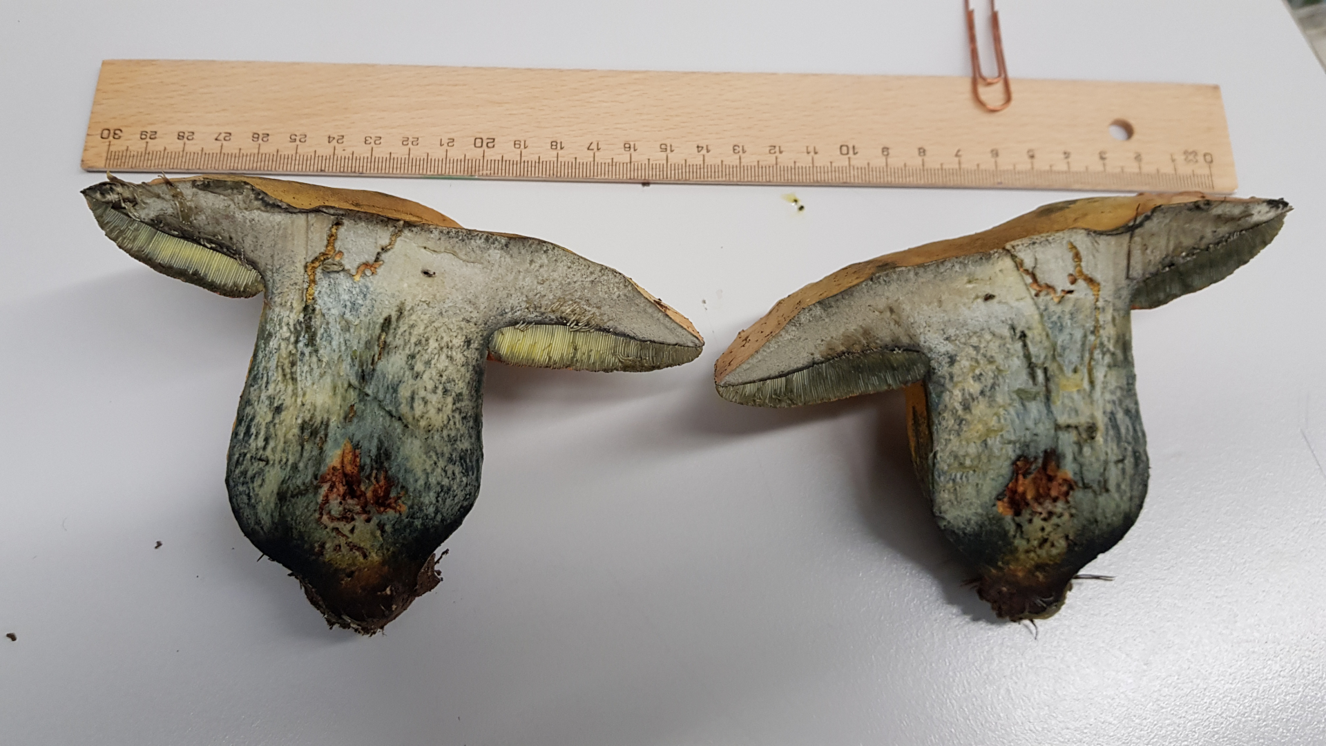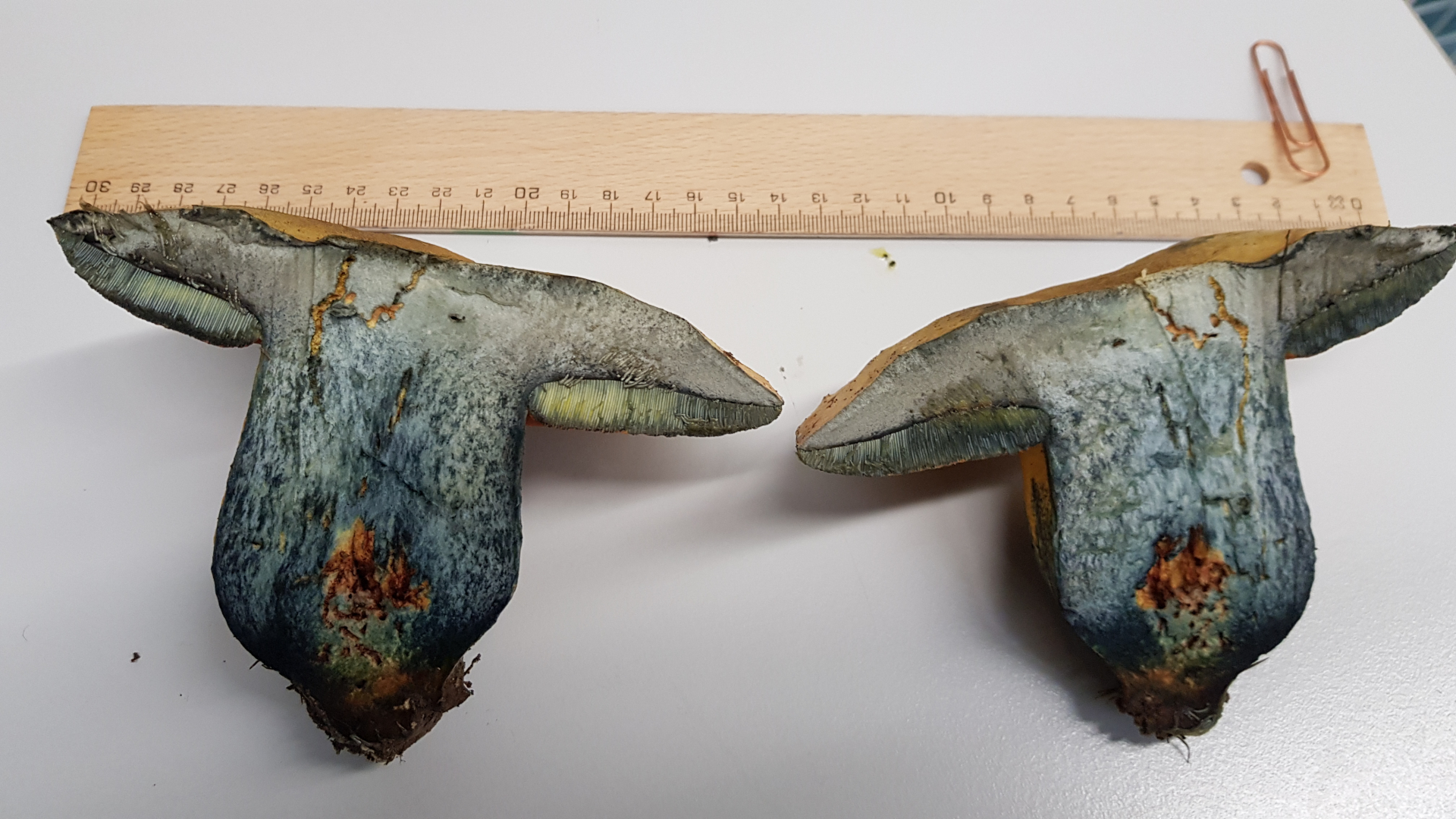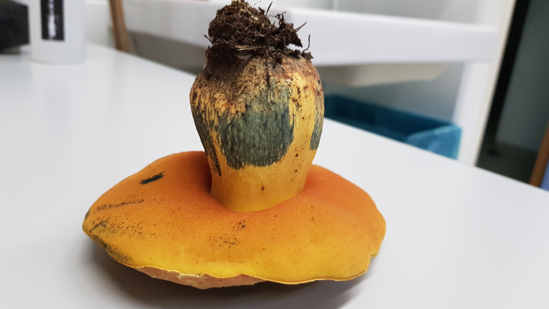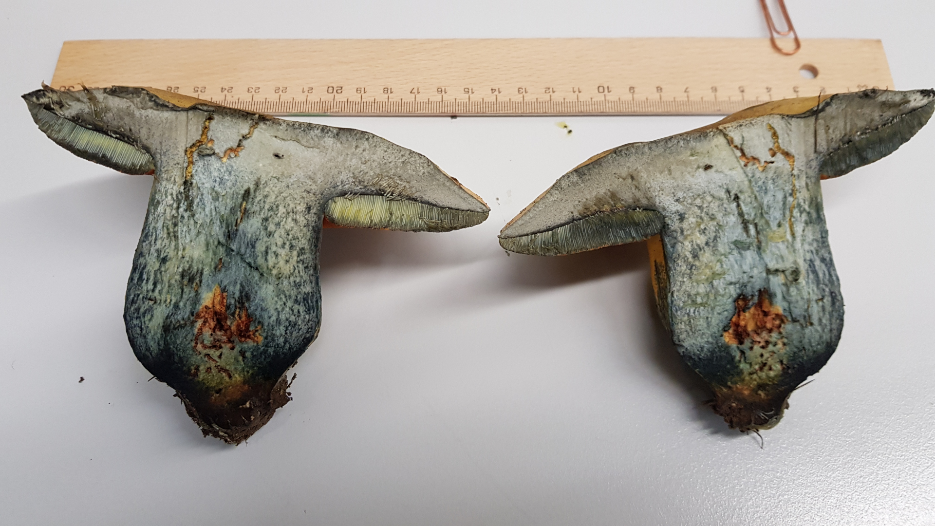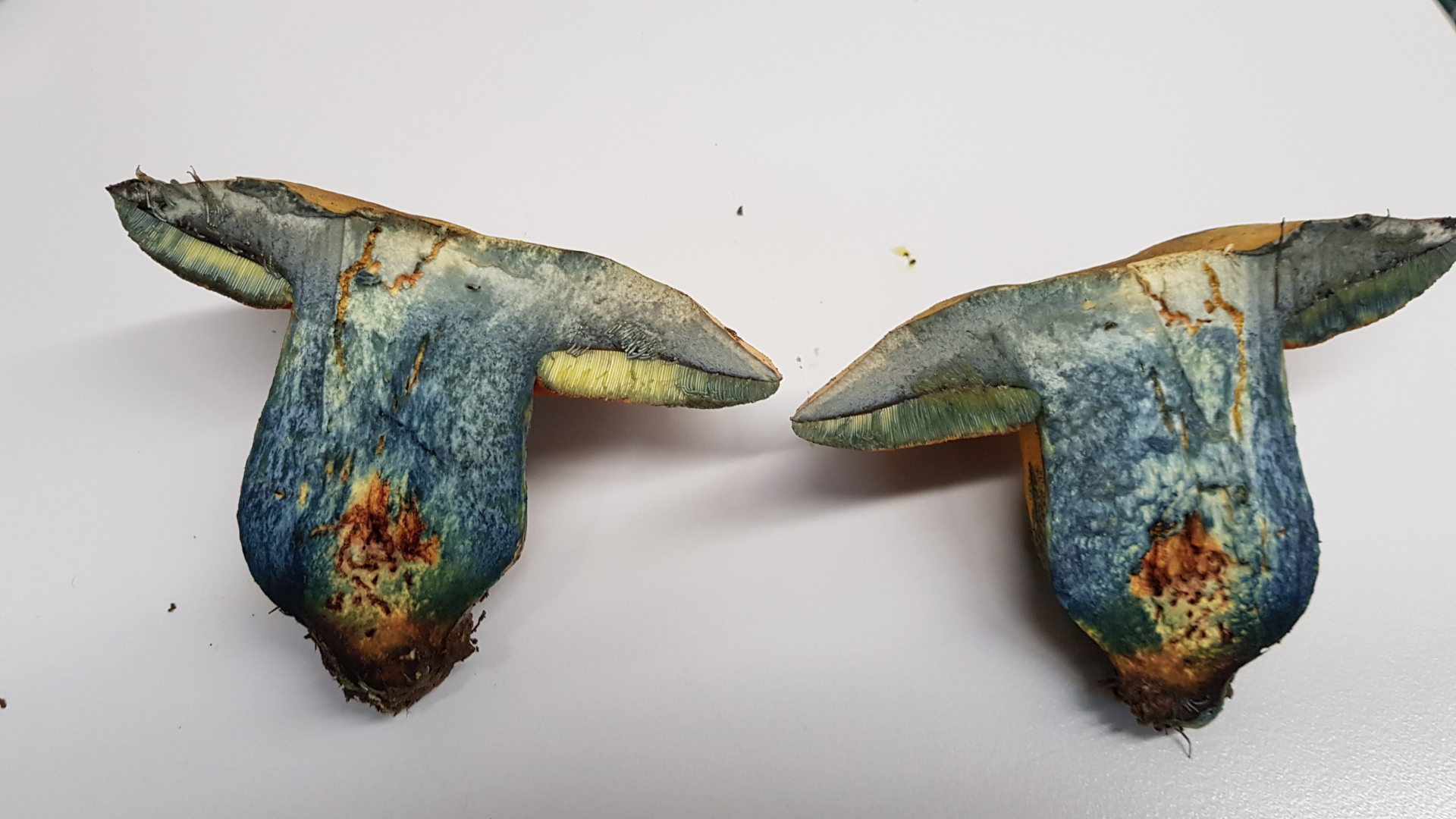 Sobald man den Pilz berührt, blaut er.