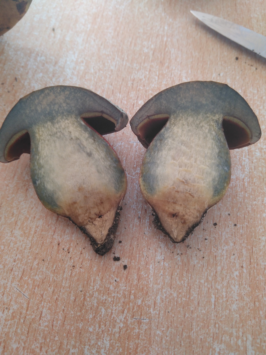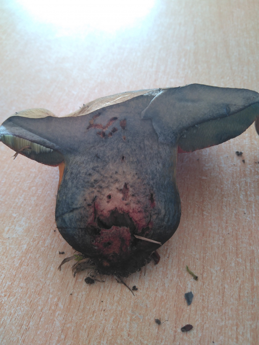 - So, und jetzt kommt es: der Stiel war ganz glatt gelb, da könnte man ein Netz wirklich nur erahnen. Durch die Berührung beim Abmachen des Pilzes aber auf einmal ein extremes blauen, und auf einmal war ein blaues Stielnetz (rund um der Berührungsstelle) zu sehen.