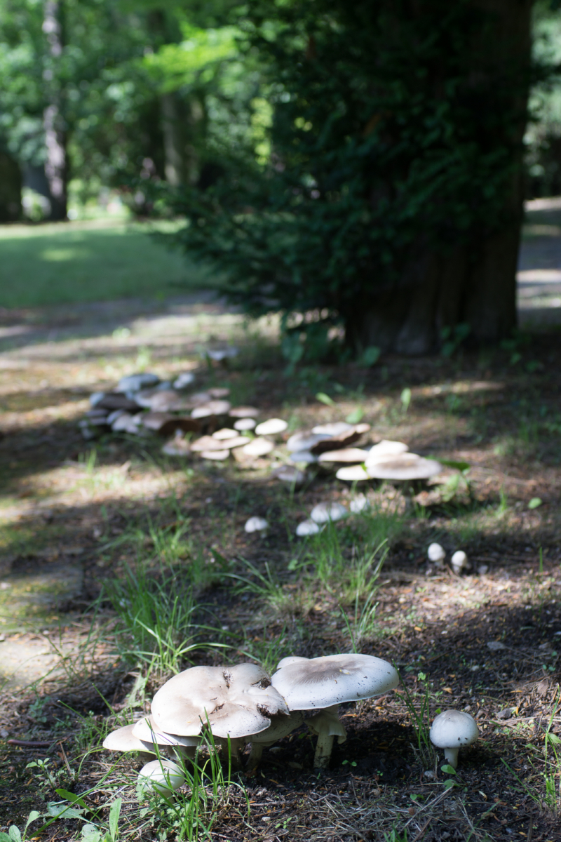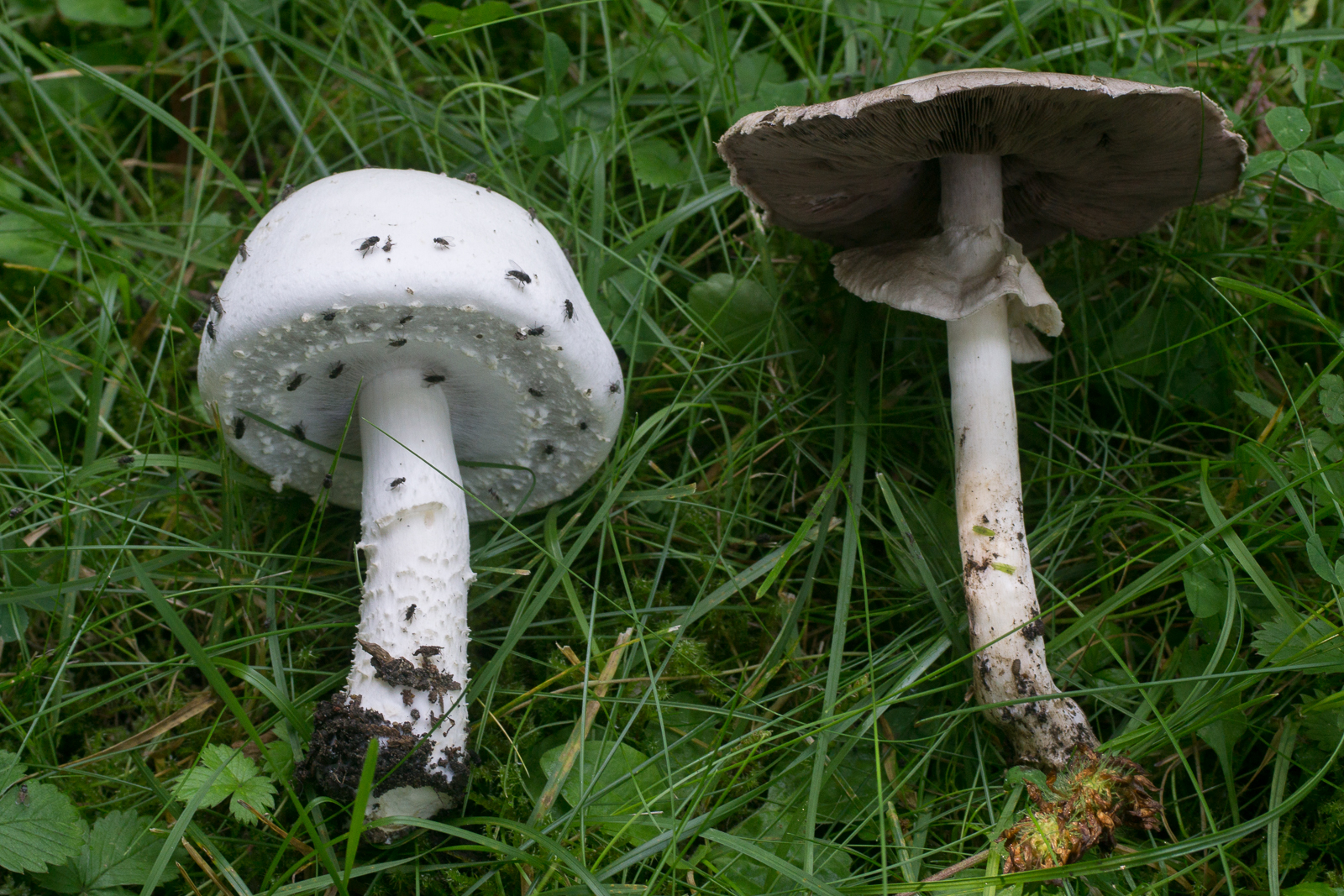 Hier zwei Schnappschüsse auch von gestern. Links einer der Anis-Champignons, rechts Karbol. Circa zwei Meter nebeneinander gewachsen.