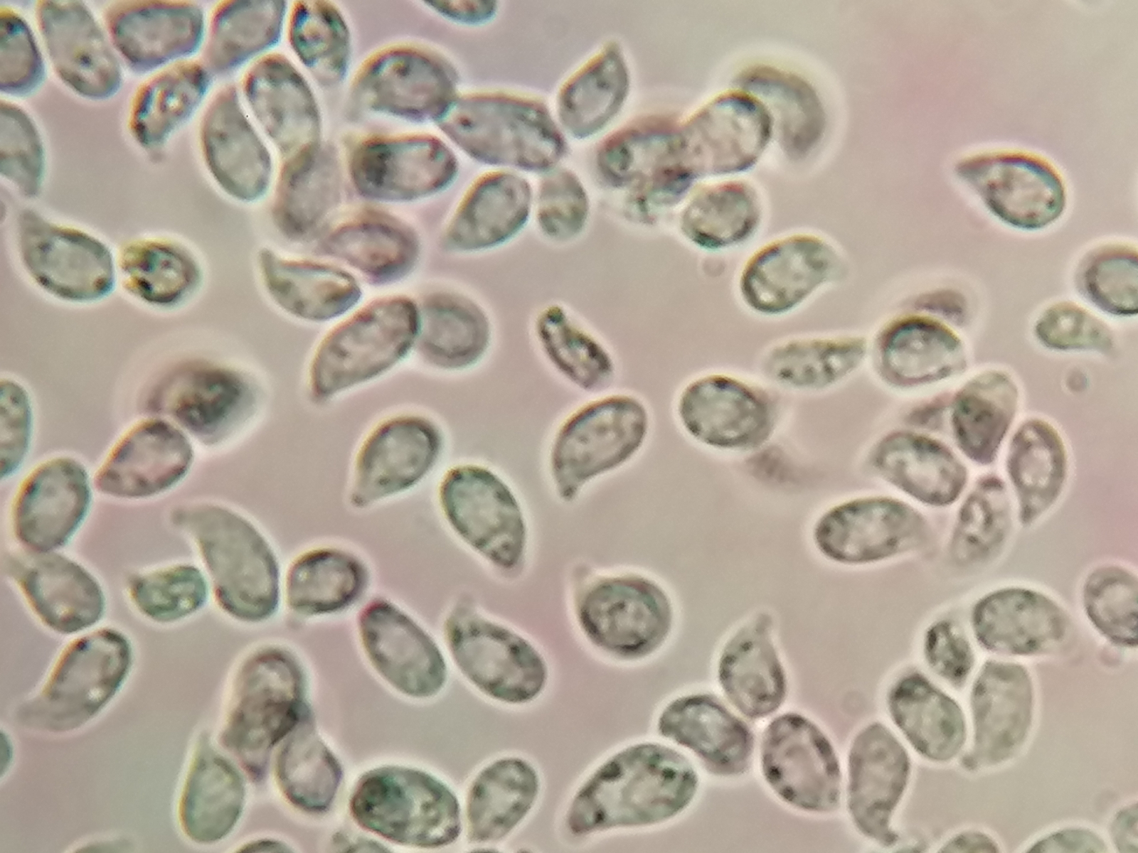 Leider hatte ich Fremdsporen - wie Claudia vermutete. Aber es war viel peinlicher: ich habe die Fotos durcheinander geworfen. Karl hat es sofort entdeckt, das konnten nicht die passenden Sporen zu meinem Rätselpilz sein, sondern Boletensporen!