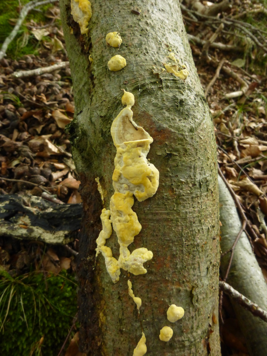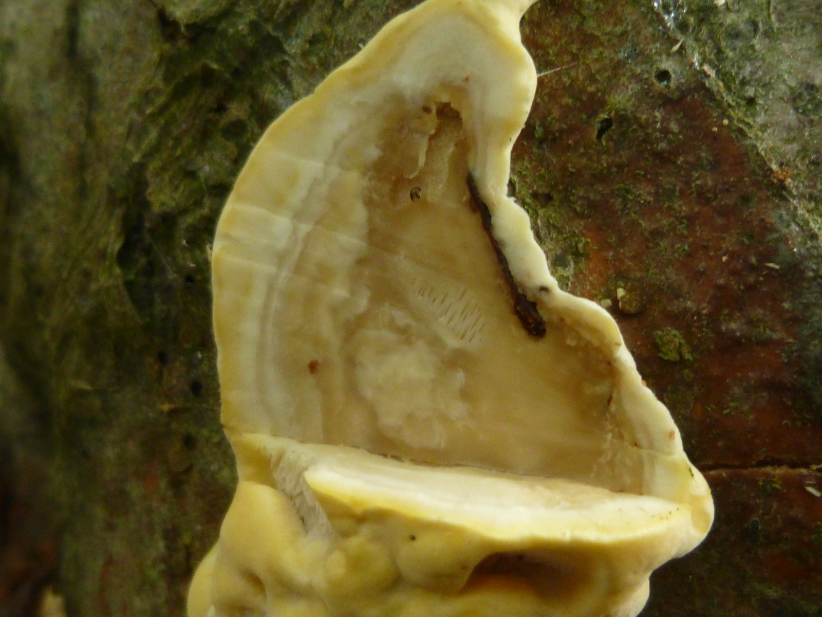 Aus der Ferne dacht' ich erst an einen Schleimpilz, die Konsistenz sowie das Schnittbild scheint mir weichporlingsmäßig zu sein. Nun per Zufall (Edit: mit Pycnoporellus fulgens) einen möglichen Kandidaten gefunden. Was meint ihr?