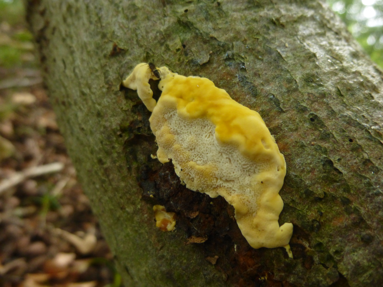 Der Schwefelporling hätte doch feinere Poren, anderen Habitus und an einem herumliegenden Ast wachsen die eigentlich auch nicht.