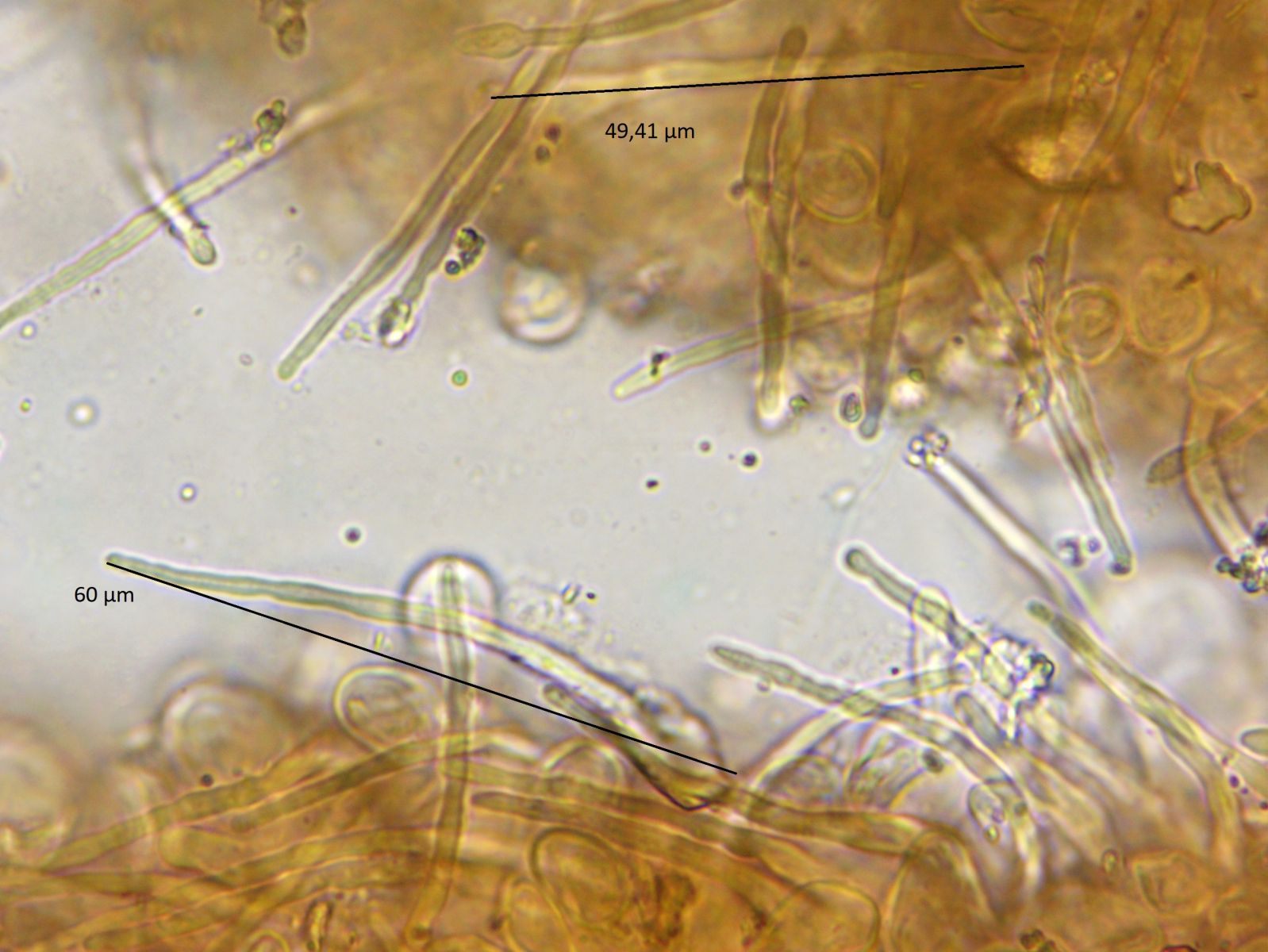 Die Haare der Hutdeckschicht sind ca. zwischen 45 und 60 Mikrometer lang. Die Basis ist meistens verdickt. Das spricht zusammen mit den orange getönten Hutfarben für den Kurzhaarigen Brätling Lactifluus oedematopus. Einen "normalen" hab ich bisher noch nicht mikroskopiert, da fehlt mir der Vergleich.