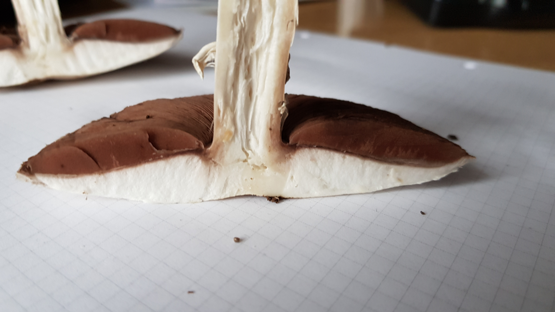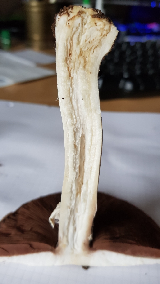 Fleisch faserig; Stiel leicht zerbrechend; keine Sollbruchstelle zwischen Hut und Stiel