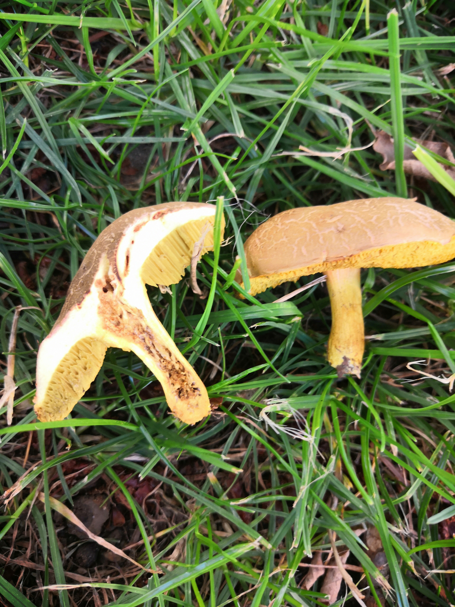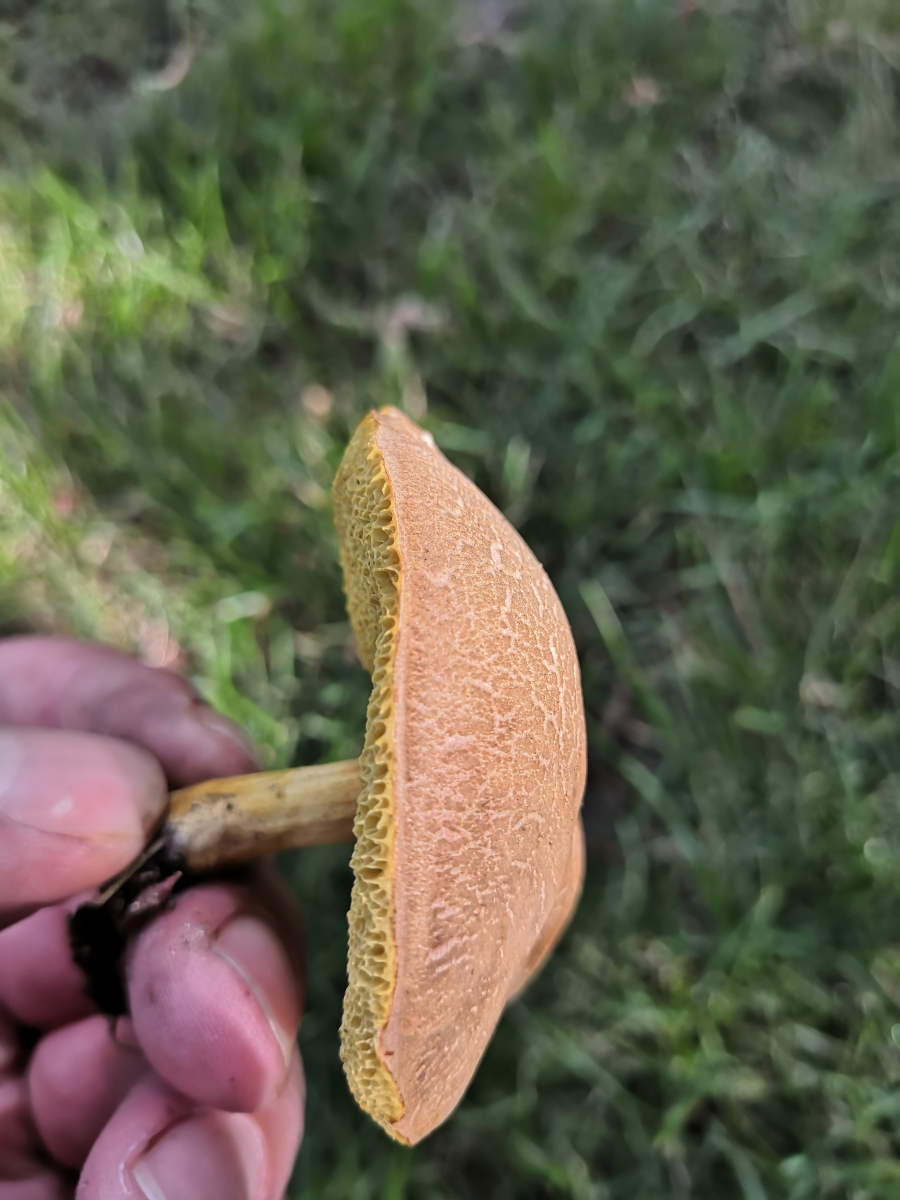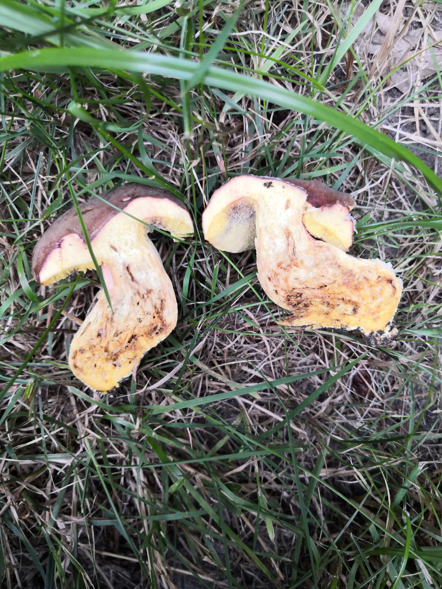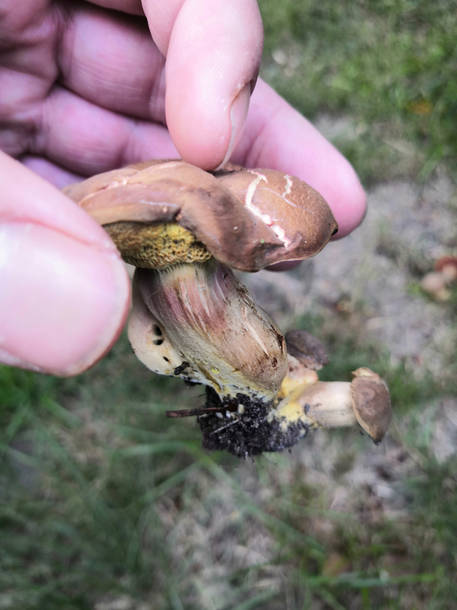 Achso, der Röhrling tritt in kleineren Gruppen von 1-4 Pilzen auf. Eventuell eine Ziegenlippe? Oder doch nur ein aus der Art geschlagener Rotfuß?