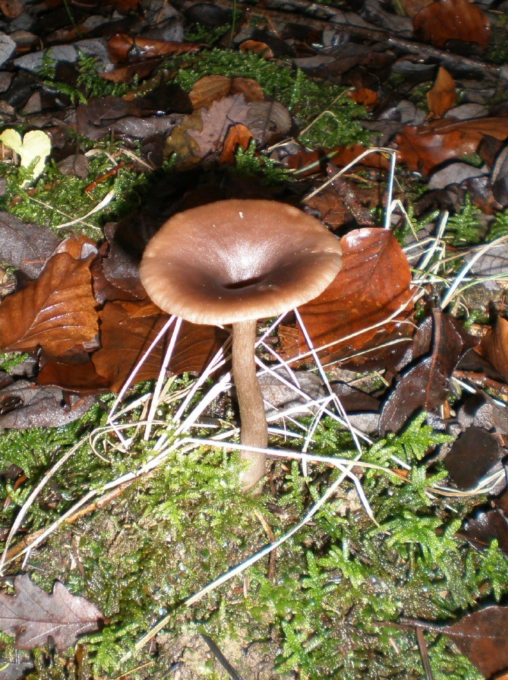 Dieser Pilz steht einzeln am Wegrand in einem Buchenwald. Etwa 10cm hoch, könnte eine Art Trichterling sein (kurz vor dem Zerfall).