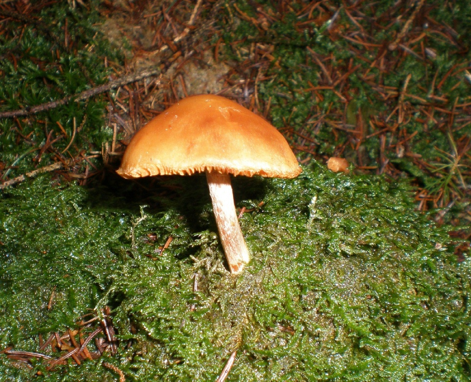 Dieser orange-braune Pilz wächst an Totholz; sogar aus Tannenzapfen heraus. Gefunden im Fichtenwald. Hutdurchmesser:4cm, Geruch: schwach pilzig. Der gewölbte Hut ist weich und nicht sehr widerstandsfähig. Ich dachte erst an einen Saftling, aber der soll nur im Sommer/Herbst auftauchen.
