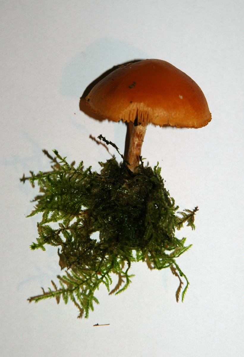 Dieser orange-braune Pilz wächst an Totholz; sogar aus Tannenzapfen heraus. Gefunden im Fichtenwald. Hutdurchmesser:4cm, Geruch: schwach pilzig. Der gewölbte Hut ist weich und nicht sehr widerstandsfähig. Ich dachte erst an einen Saftling, aber der soll nur im Sommer/Herbst auftauchen.