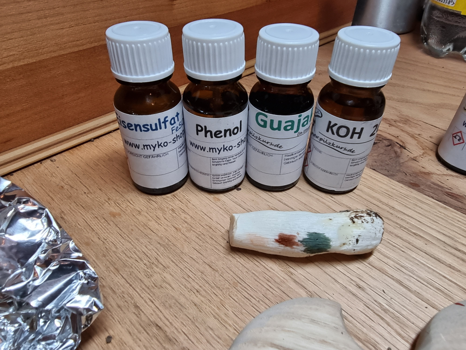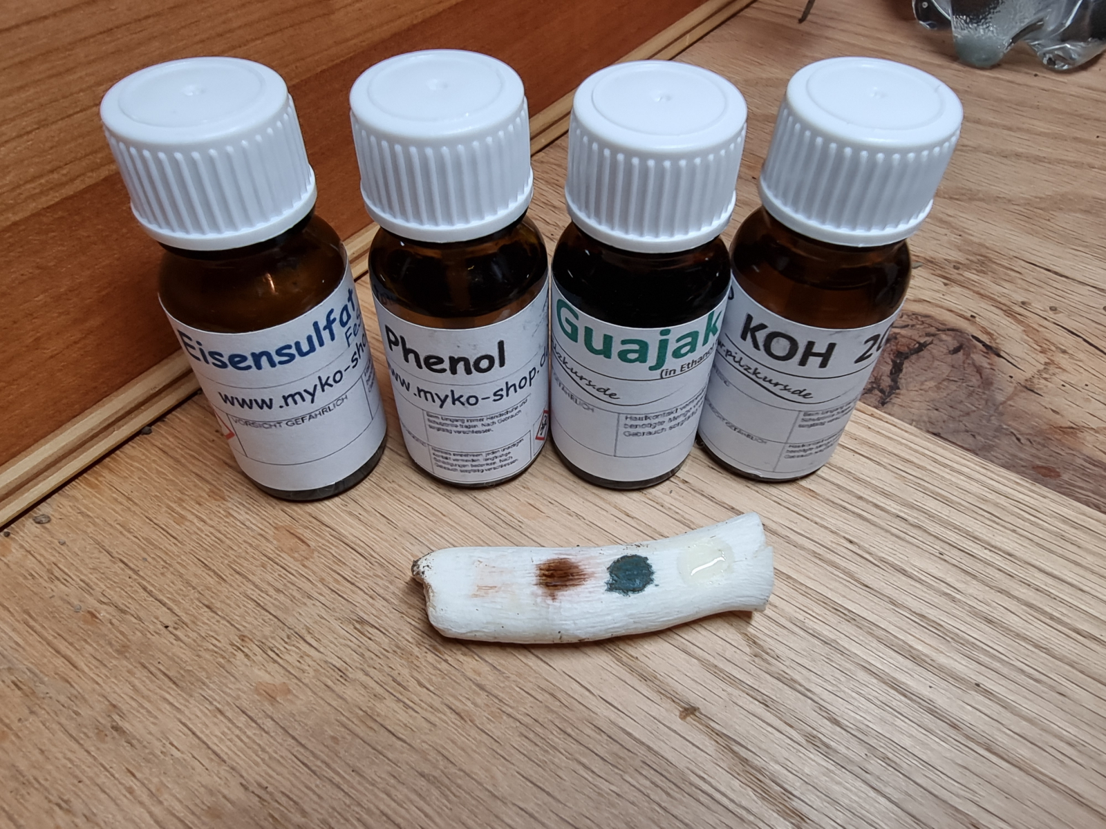 Makrochemische Reaktionen: Eisensulfat und KOH negativ, Phenol und Guajak siehe Bild