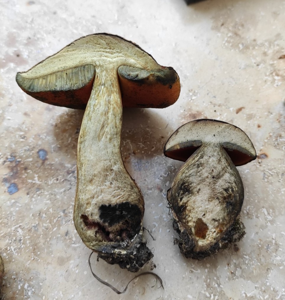 Suillellus queletii im selben Habitat ist auch ganz praktisch, weil ebenfalls eine wärmeliebende Art. Hinzu kommt die extrem feine Beflockung, das starke Blauen selbst bei leichter Berührung, das dunklere Tomentum, die gelbliche Stielspitze, die gelbe Zone an den Poren am Hutrand. Ökologisch ist Linde wohl auch typisch, Aufsammlungen darunter waren meines Wissens nach genetisch alle N. xanthopus und hier kam oft kein anderer Baumpartner in Frage. Bei Fagus wird's schwieriger, da gehen beide Arten gerne ran. Hutfarbe kann man vermutlich zur Abgrenzung größtenteils ignorieren, ich habe da bei molekular bestätigten Funden alle möglichen Farbvariationen gesehen, gelb, braun, schwarz geht alles. Bei relativ neu beschriebenen Arten, muss man meistens nach Fachartikeln suchen, in den Büchern dauert das natürlich eh die bei Neuauflagen eingepflegt werden...