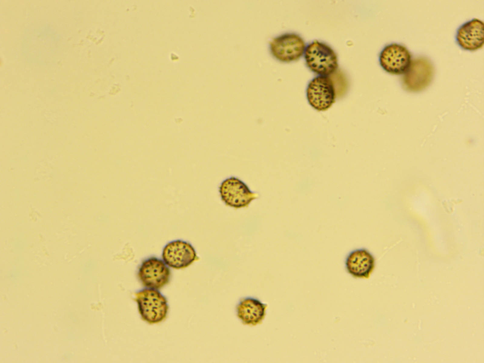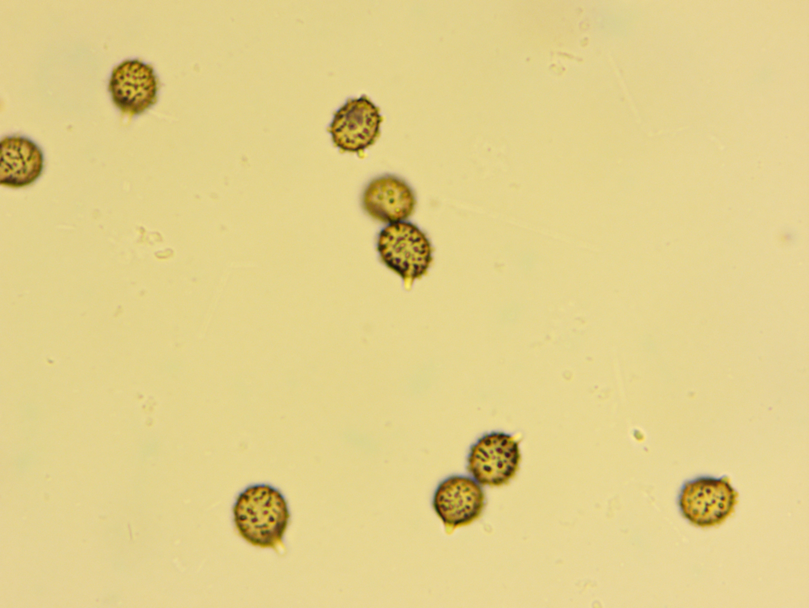 Sporen: Isoliertwarzig, selten mit zusamenfließenden Warzen, 7,5-8,5 x 6-7 Mikrometer. Ornament bis zu 1 Mikrometer hoch.