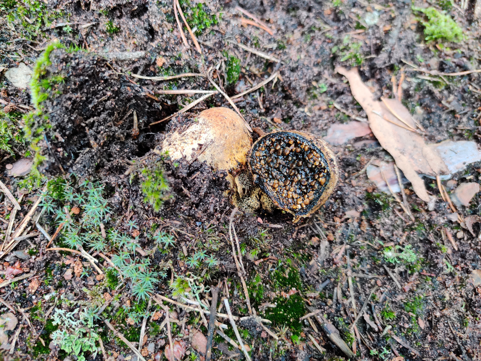 1. Der erste Neuling für mich war direkt eine große Freude. Ich dachte zuerst an einen der Kartoffelboviste, die in letzter Zeit häufig vertreten sind. Als ich in die Knie ging und einen Fruchtkörper anschnitt erkannte ich dann aber den Erbsenstreuling (Pisolithus arhizos).