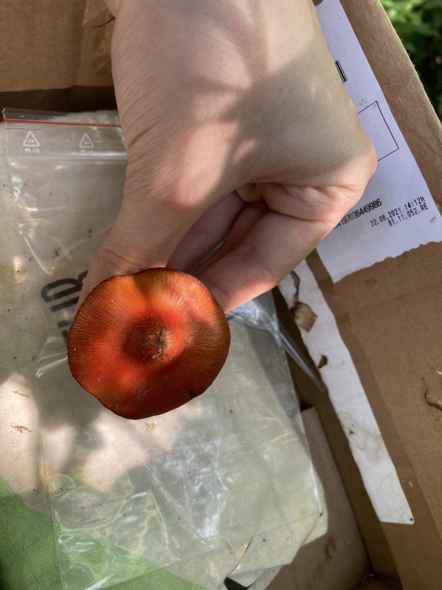 Hutoberseite: Kräftig Rot-Orange, Spitzkegelig im Zentrum, nach außen hin radial gefasert, 30-40 mm Durchmesser, seidig glänzend.