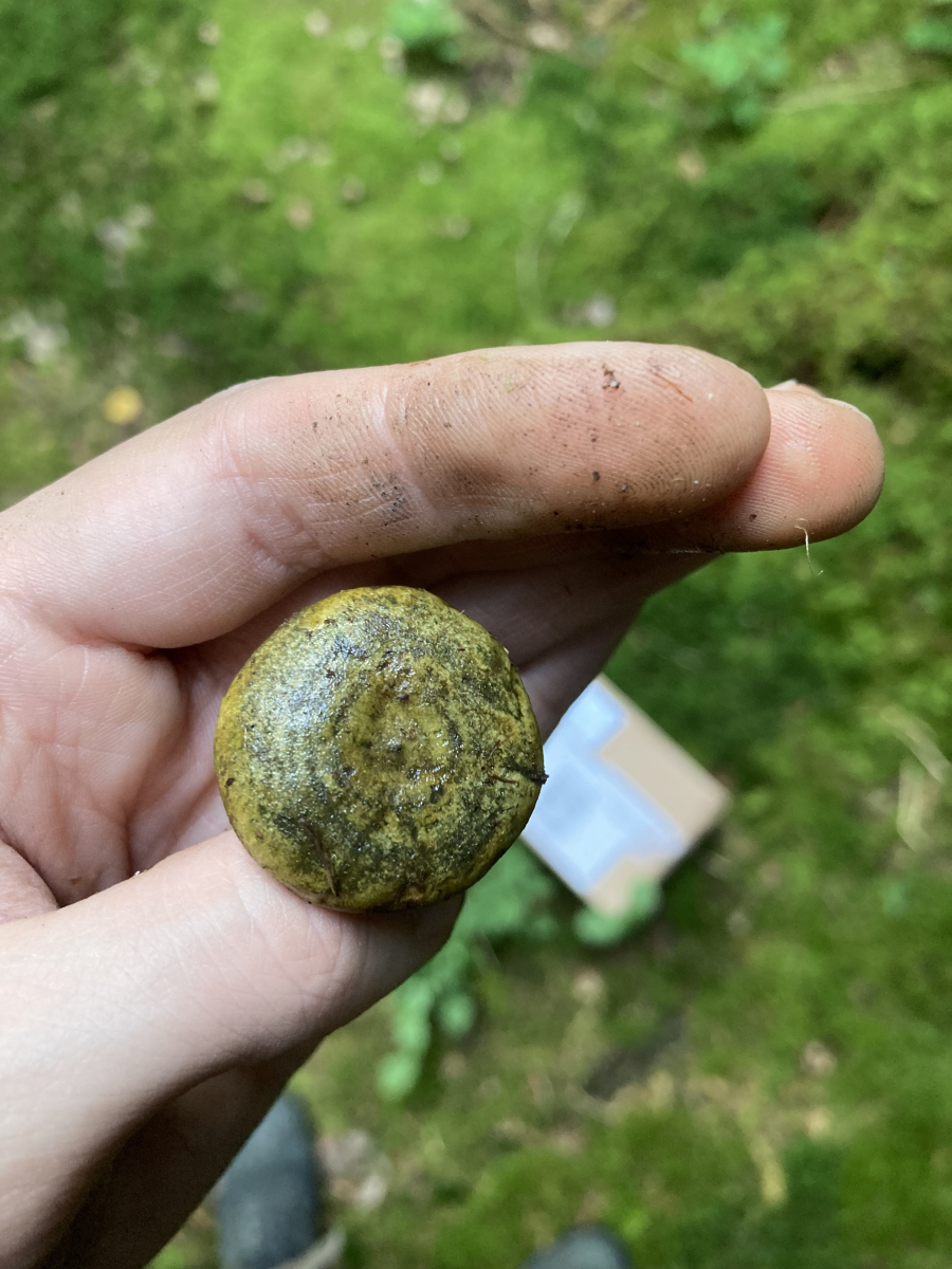 Hutoberseite: 60-100 mm Durchmesser, Olivgrün, im Zentrum dunkler, im Alter trichterförmig, konzentrisch gezohnt.