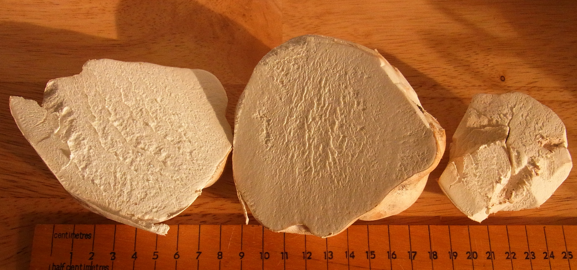Boviste, vor allem Kartoffelboviste, die kennt man ja, aber einen Riesenbovist habe ich bisher immer nur in Videos und in Büchern gesehen, bis zum letzten Samstag. Eigentlich wollte ich in einen anderen Wald, aber es kam etwas privates dazwischen, daher bin ich nur im Ort in einem kleinen Waldstück spazieren gegangen. Da gibts überwiegend Buchen und Kastanien, ein paar andere Bäume. Großartig brauchbares hab ich da nie gefunden, außer wurzelnde Bitterröhrlinge, die sehen zwar schön aus, aber das wars dann auch. Im Wald sind mehrere freie Stellen, ein Grillplatz und ein Bolzplatz. An einigen Stellen mäht die Stadt gelegentlich, bzw. lädt Rasenschnitt ab oder geschreddertes. Und auf einmal seh ich da von weitem was großes weißes. Und siehe da, einer war etwa so groß wie ein Handball, mehrere etwa die übliche Kohlrabigröße, ein paar kleinere etwa in Tennisballgröße. Farblich fast weiß außen, ganz leicht beige. Innen komplett weiß. Rochen relativ intensiv pilzig beim anschneiden, recht streng, was sich nach ein paar Stunden etwas verlor, wenn die Stellen antrockneten. Maden Fehlanzeige bei allen 4, die ich mitgenommen hatte. An den Fraßstellen ein Geruch, den ich kannte, es roch ähnlich wie wenn man Spiegeleier gebraten hat, dieser Geruch von knusprigem Eiweiß. Kein Stiel, Verbindung zum Boden relativ klein, 1 - 1,5 cm mit weißen Myzelfäden. Haut ließ sich leicht entfernen, fast als ob man eine Mandarine pellt, habs mit dem Messer gemacht. Farbe an den Fraßstellen auch etwas beige, aber kaum vom Rest unterschiedlich. Nach eingehener Bestimmung, allein der Größe wegen, defintiv Riesenbovist. Bin dann noch einmal zurück und habe ein zwei ganz kleine entnommen und zerschnitten bezüglich des Risikos kleinerer kugeliger Knollenblätterpilze und ähnlichem und habe das mit der Lupe angeschaut, nichts zu sehen, auch keine minimalen Gelbfärbungen, wie bei ganz jungen Kartoffelbovisten. Alles ganz weiß. Also den größeren in Scheiben geschnitten und paniert und mit reichlich Olivenöl in die Pfanne.