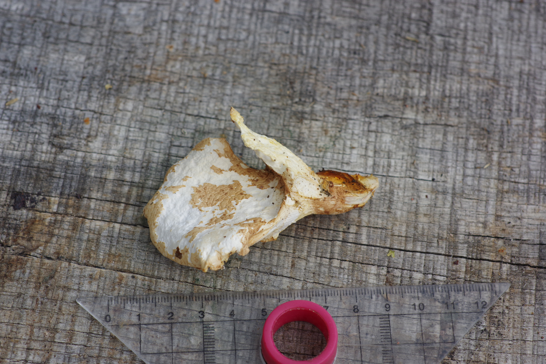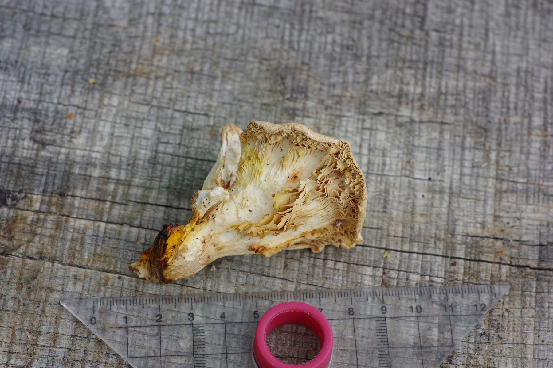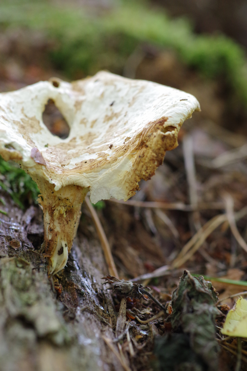 Hutdurchmesser bis 8 cm, deutlich trichterförmig, Trama weiß, Hutoberfläche sandfarben, aber überwiegend ab (gefressen?). Die Lamellen sind überwiegend weg, erkennbar ist, dass sie mindestens 6 mm breit sind / waren und am Stiel herunterlaufend. Der Stiel ist kräftig, nach unten leicht dunkler werden. Gekostet habe ich nicht. Geruch irgendwie nach Spülmittel, wie ein künstliches Zitronenaroma, aber schwach.