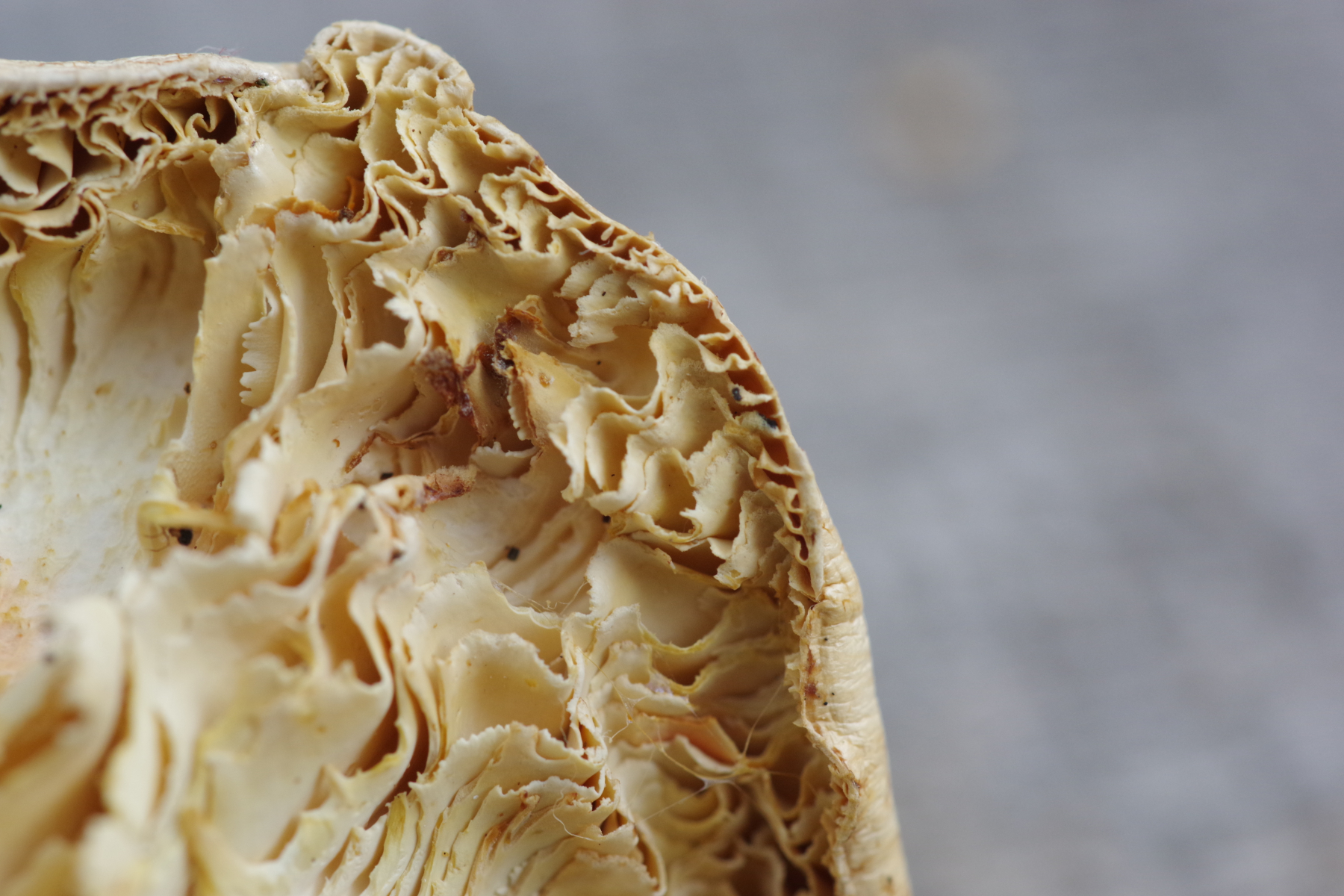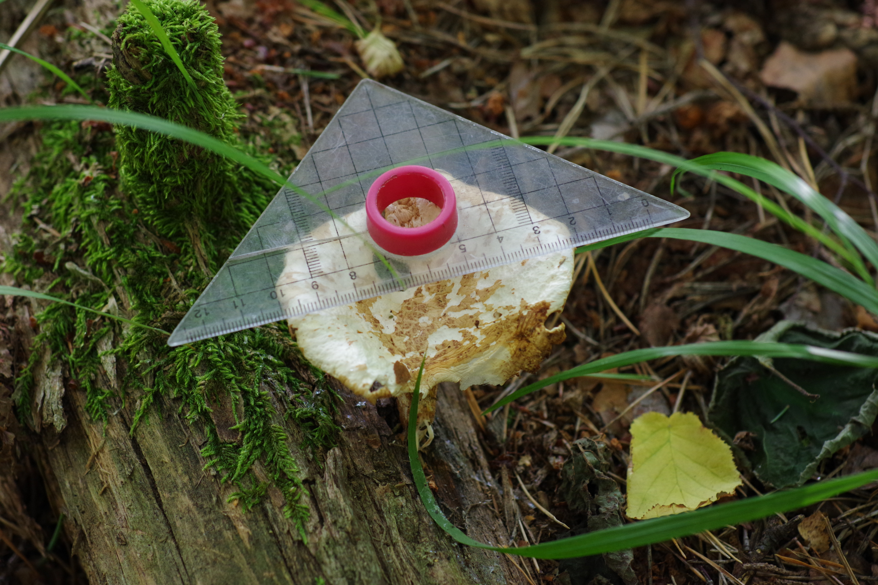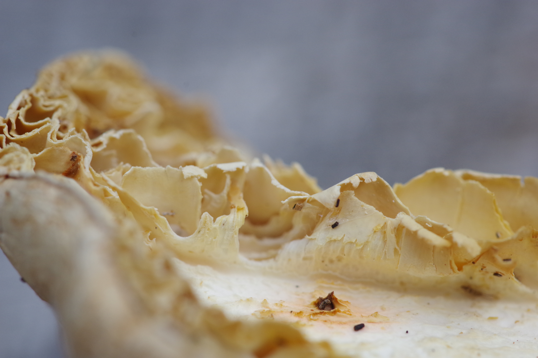 Hutdurchmesser bis 8 cm, deutlich trichterförmig, Trama weiß, Hutoberfläche sandfarben, aber überwiegend ab (gefressen?). Die Lamellen sind überwiegend weg, erkennbar ist, dass sie mindestens 6 mm breit sind / waren und am Stiel herunterlaufend. Der Stiel ist kräftig, nach unten leicht dunkler werden. Gekostet habe ich nicht. Geruch irgendwie nach Spülmittel, wie ein künstliches Zitronenaroma, aber schwach.