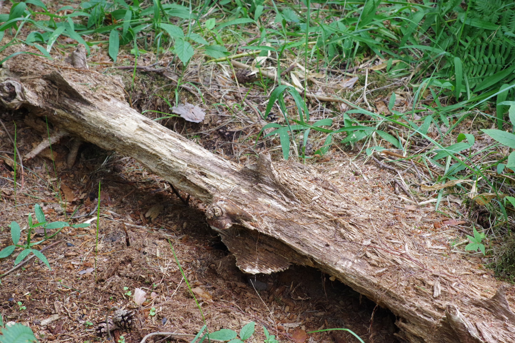 An einer Kiefer, die seit mindestens 10 Jahren liegt und im Außenbereich morsch oder ganz weg ist, der ggf. harzige Kern kann es oft auch auf 30-50 Jahre bringen, eh der vermodert.