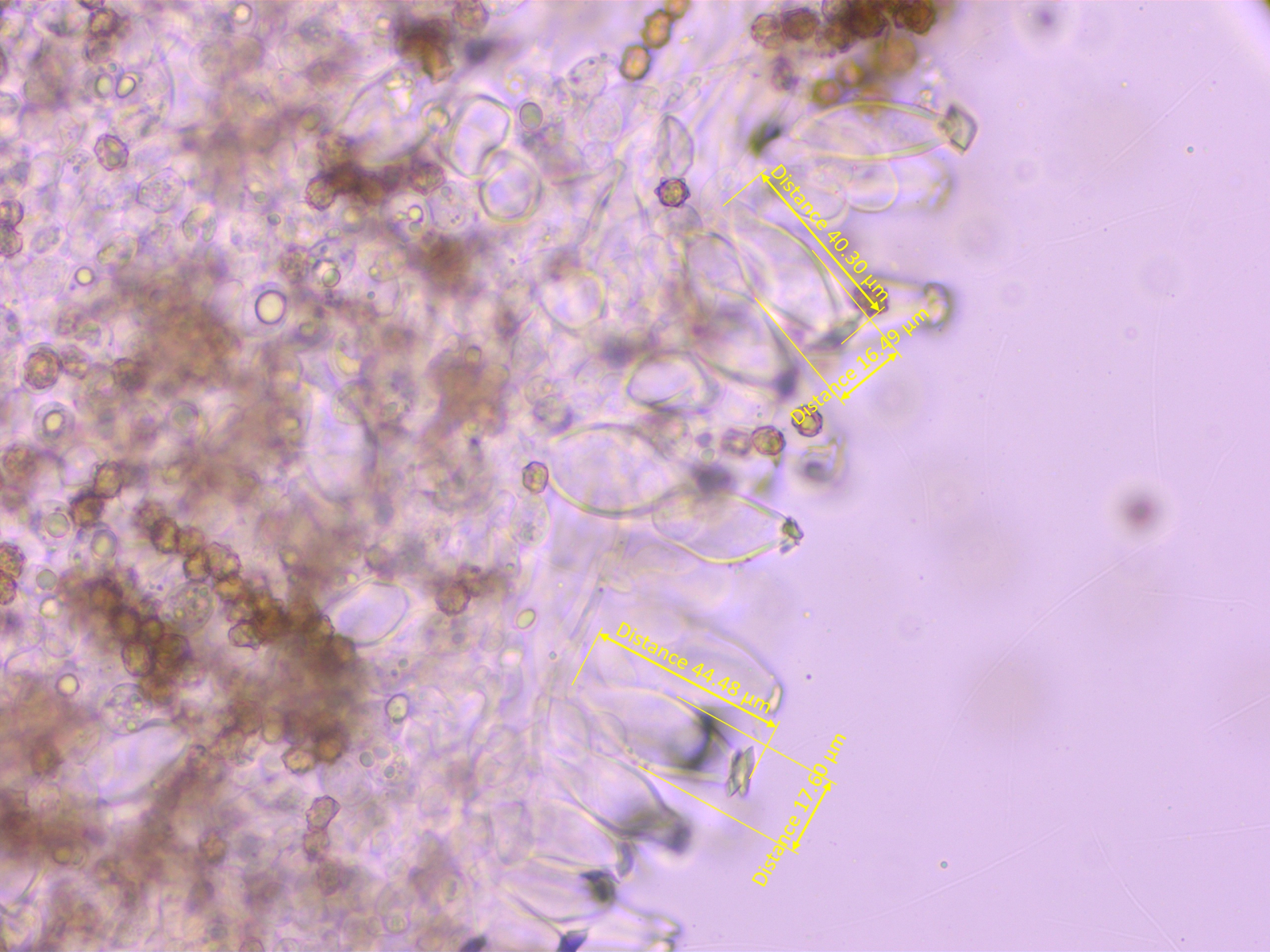Cheilozystiden recht dünnwandig, moderat bauchig, 52-55-59 x 13-16-19 µm, Q = 3-3.5-4