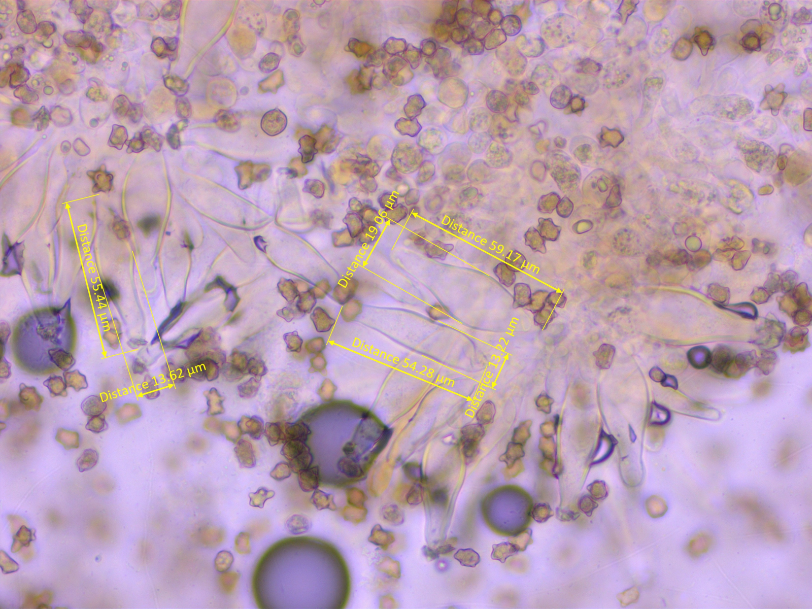 • Ja die sind variabel. Ich häng mal ein Foto an, wo du sowohl schlankere als auch diese breiten Zystiden siehst. Ausschlaggebend ist auch hier wieder das, was gerade jemand in Bezug auf Neoboletus-Arten schrieb: Es ist die Gesamtheit der Merkmale, die eine Art ausmacht. Es passen: die Farbe, die Hutoberfläche, der ganz bereifte Stiel, Form und Größe der Sporen, Länge der Zystiden und die grundsätzliche "Art" der Zystiden - die aber eben mal länglicher und mal breiter sein können. Und natürlich der Standort, ebenso wie die Jahreszeit.