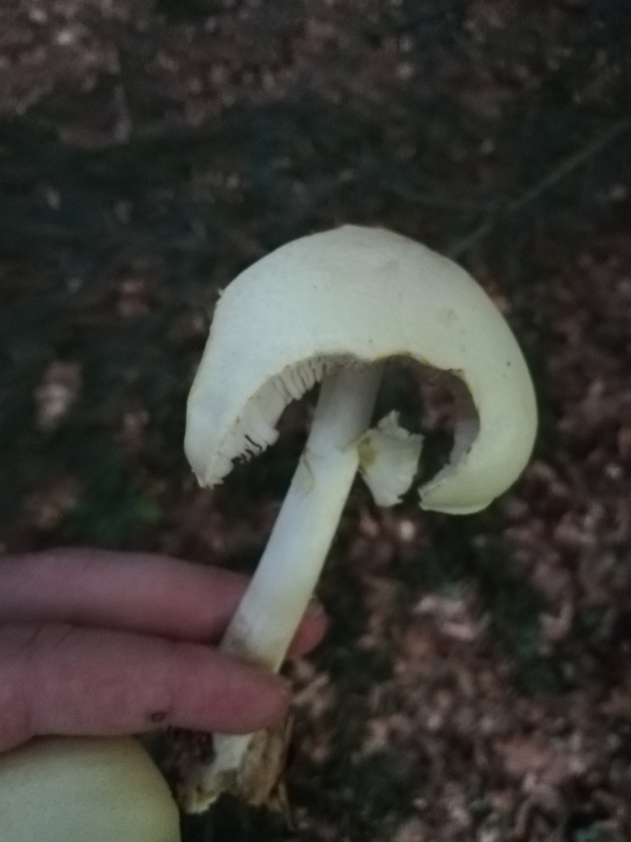 Ich denke aber, dein Fruchtkörper gilbt und riecht zugleich nach Marzipan, gehört also in die Gruppe um den Schiefknolligen Anischampignon (Agaricus essettei s.l.).
