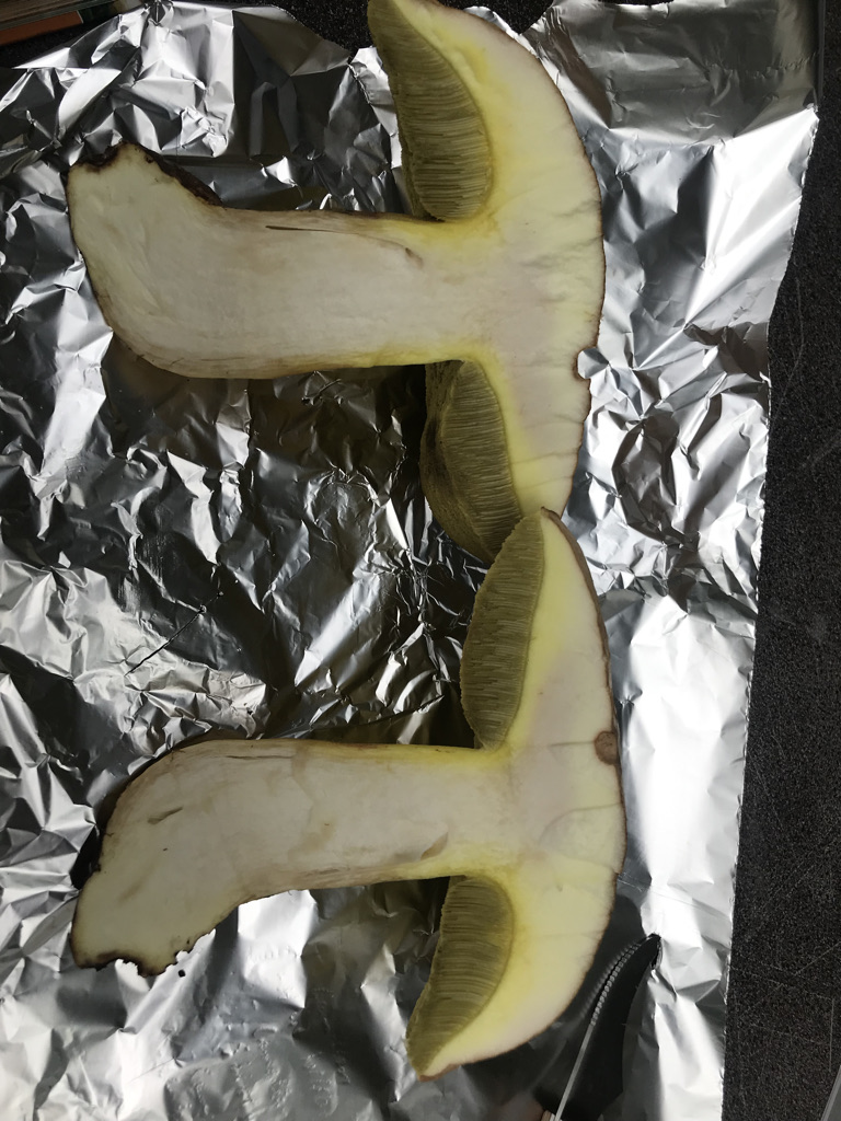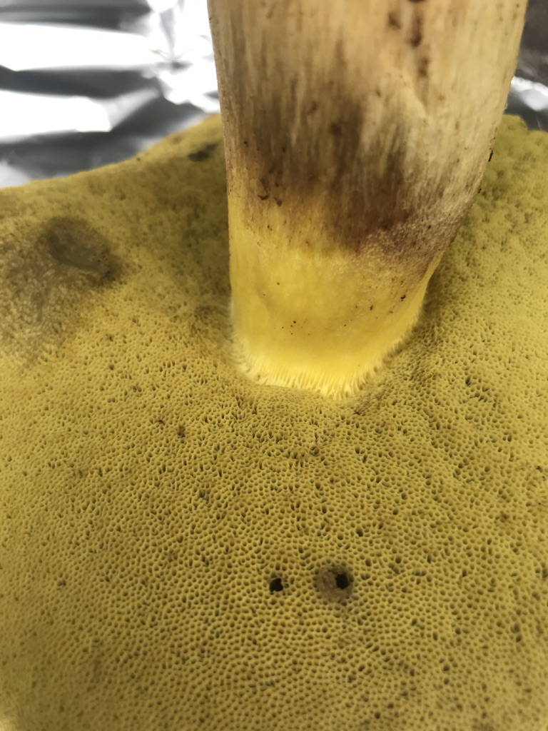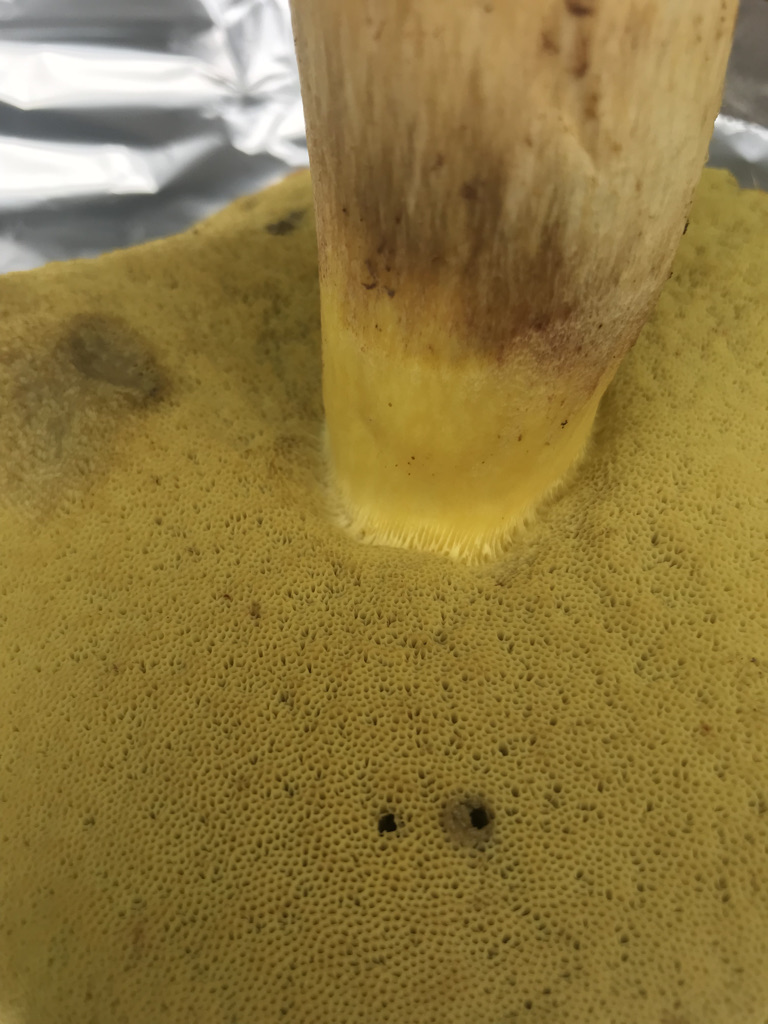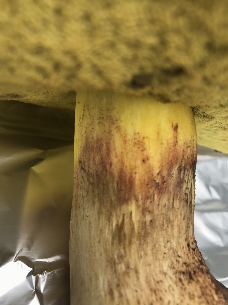 Stiel: Gelb, braun-rot überfasert, zum Hut hin leuchtend gelb