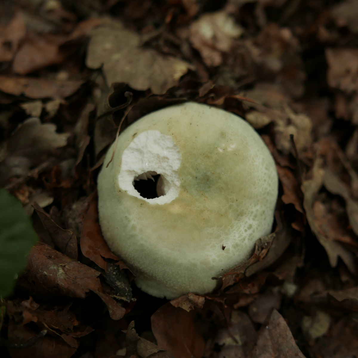 Die Knollis sprießen wie Hexeneier aus dem Boden, auf einer Flächen von vielleicht 10 x 10 Meter fand ich etwa 30 Fruchtkörper, die meisten als kleine „Eier“ noch im Boden, gerade durchs Laub lugend.