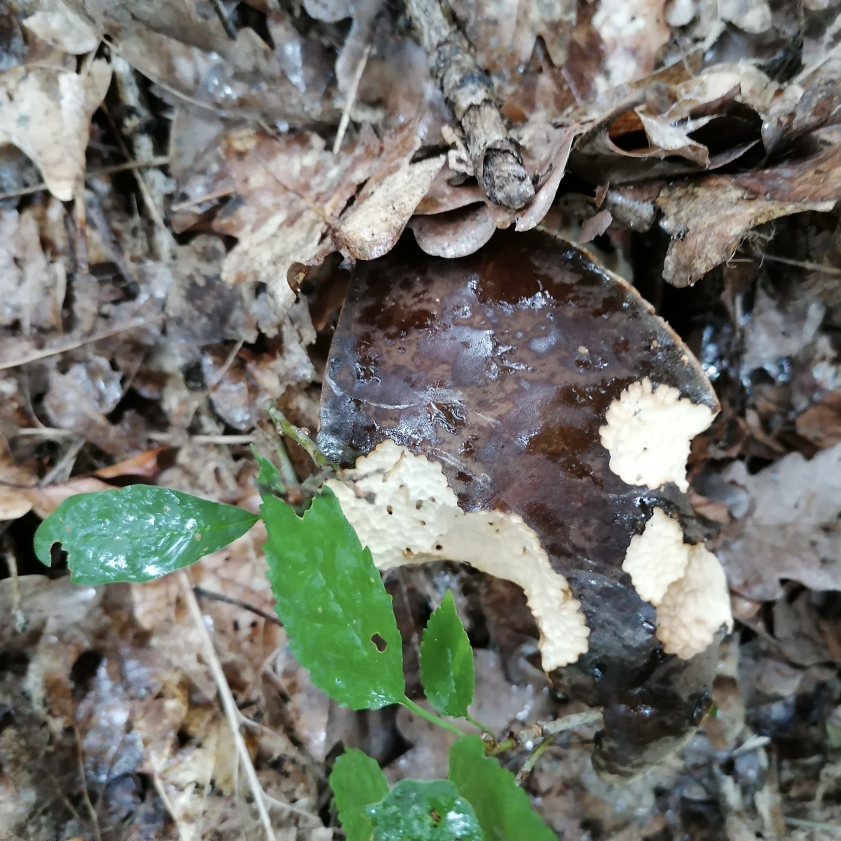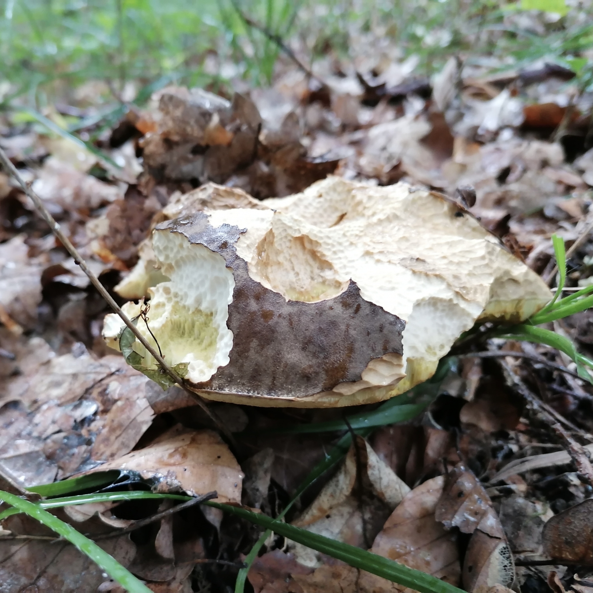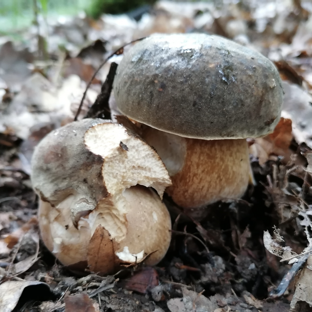 Und einen Wald weiter gab es dieses Jahr sogar wieder einige Schwarzhütige Steinpilze, Boletus aereus, etwa 10 Fruchtkörper auf etwa 20 x 30 Meter. Allerdings waren fast alle ziemlich groß und ziemlich angefressen - die Schnecken waren wohl ziemlich hungrig. (Hier war es so regnerisch, dass ich nur noch mit dem Handy fotografiert hatte)